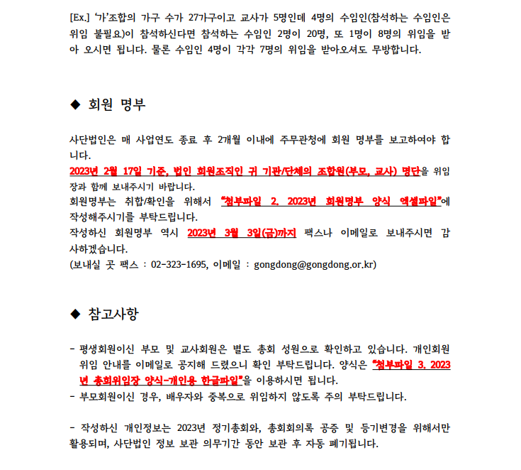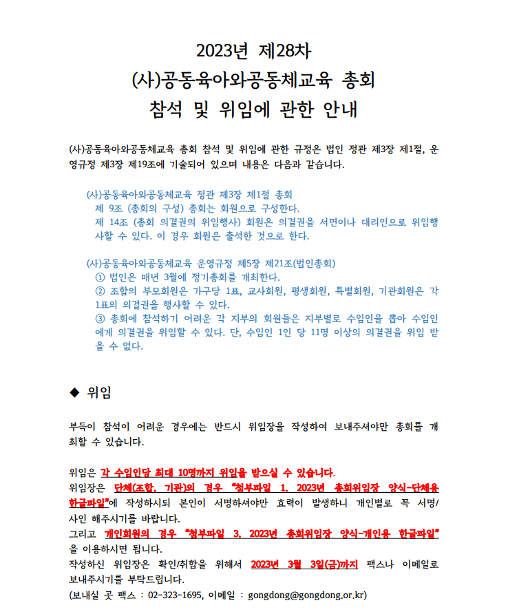 2023년 제28차 (사)공동육아와공동체교육 정기총회 2차 안내(참석 및 위임 안내)