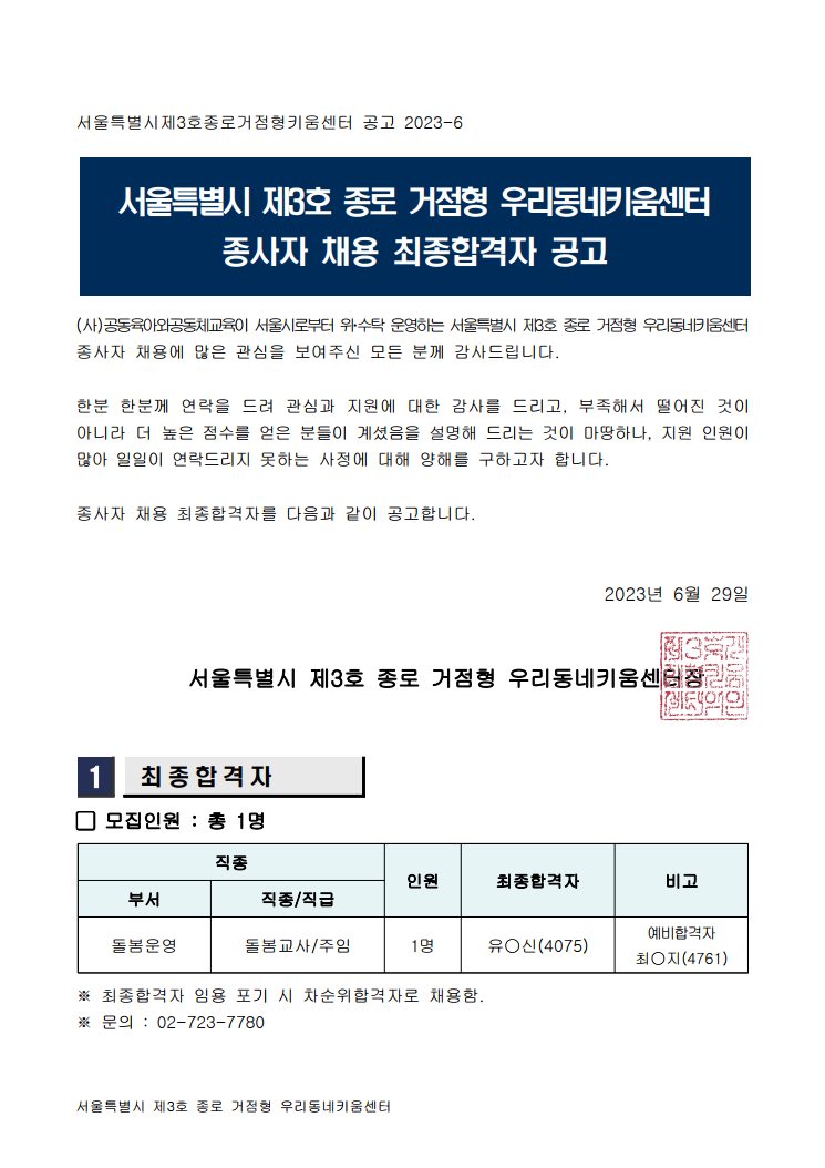 서울시 제3호(종로) 거점형 키움센터 채용결과 공고 페이지 정보 작성자 운영자 작성일23-06-29 19:08 조회901회 본문 댓글목록 등록된 댓글이 없습니다. 이전글 다음글 목록