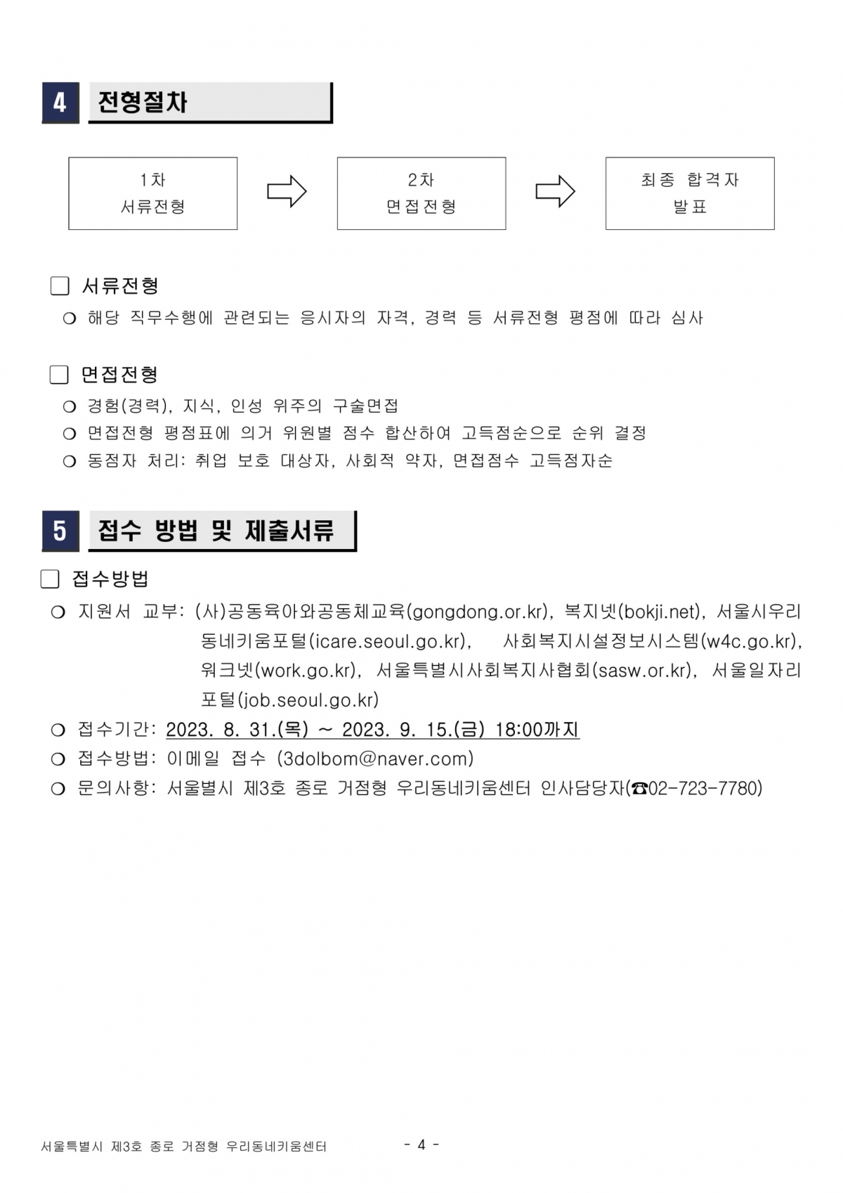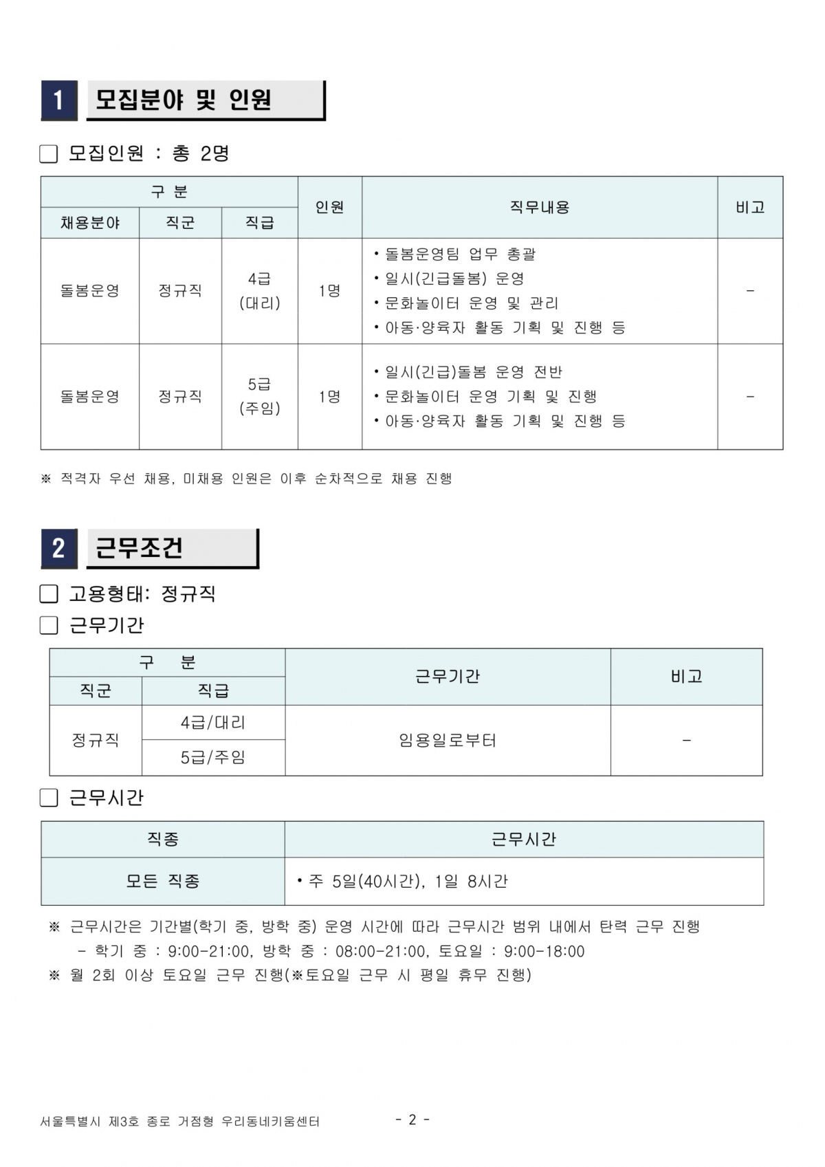 서울특별시 제3호(종로) 거점형 키움센터 종사자 채용 공고(2인/ 4급, 5급)