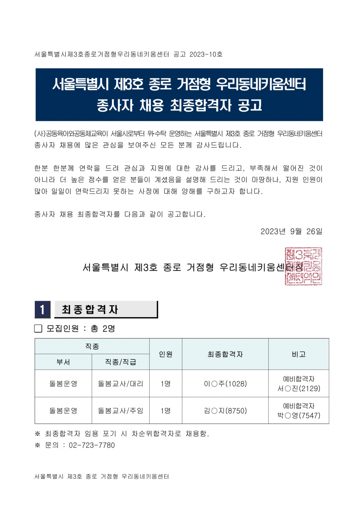 서울시 제3호(종로) 거점형 키움센터 채용결과 공고(대리, 주임) 페이지 정보 작성자 운영자 작성일23-09-26 11:22 조회799회 본문 댓글목록 등록된 댓글이 없습니다. 이전글 다음글 목록