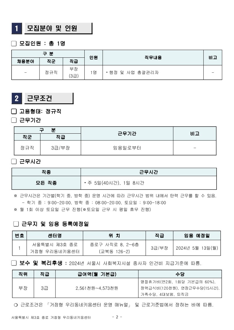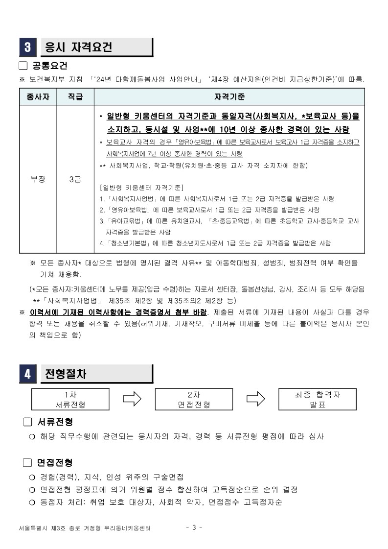 서울특별시 제3호(종로) 거점형 키움센터 종사자 채용 재공고(1인, 부장, 3급)