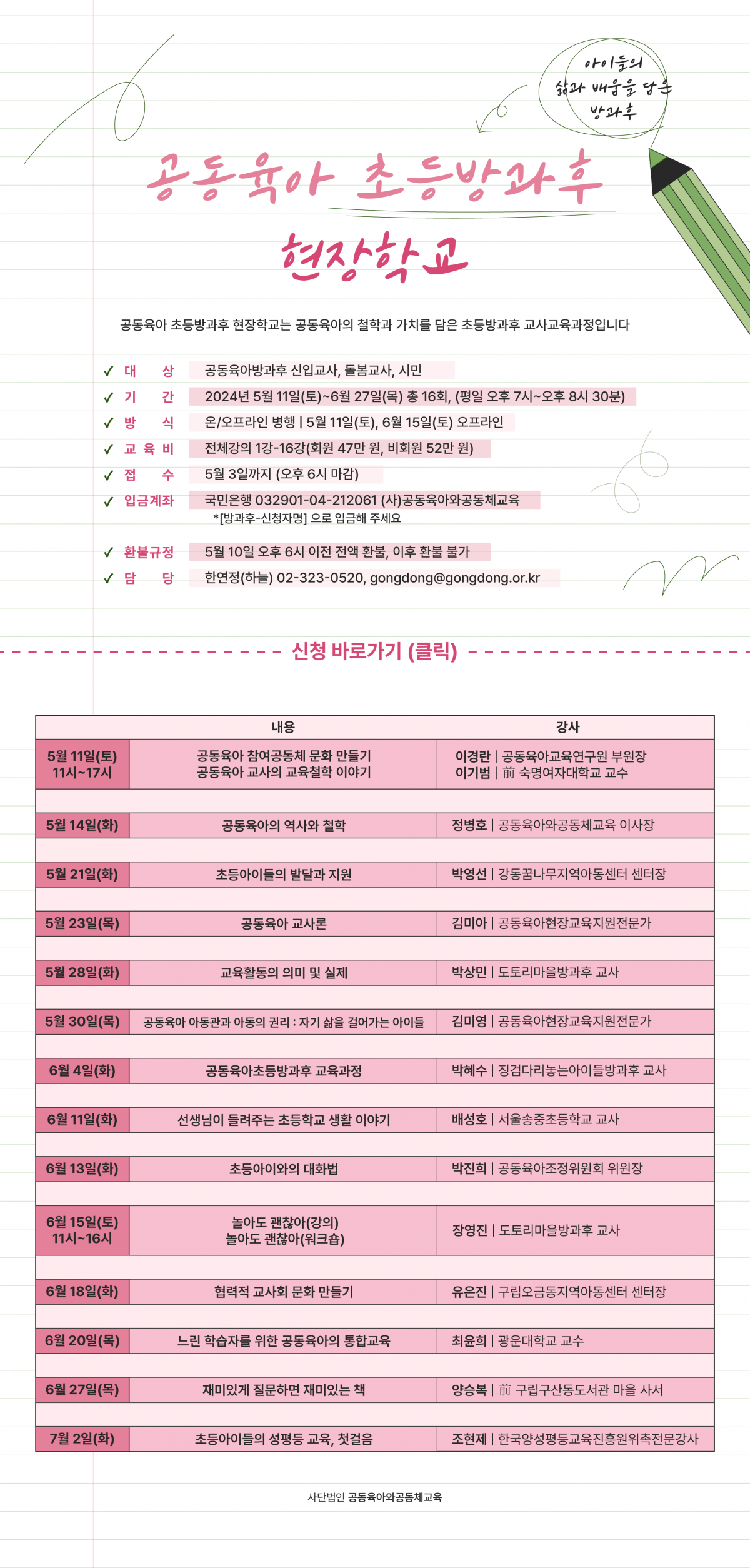 [공동육아교육연구원] 공동육아 초등방과후 현장학교 페이지 정보 작성자 운영자 작성일24-04-17 09:47 조회1,042회 본문 댓글목록 등록된 댓글이 없습니다. 이전글 다음글 목록