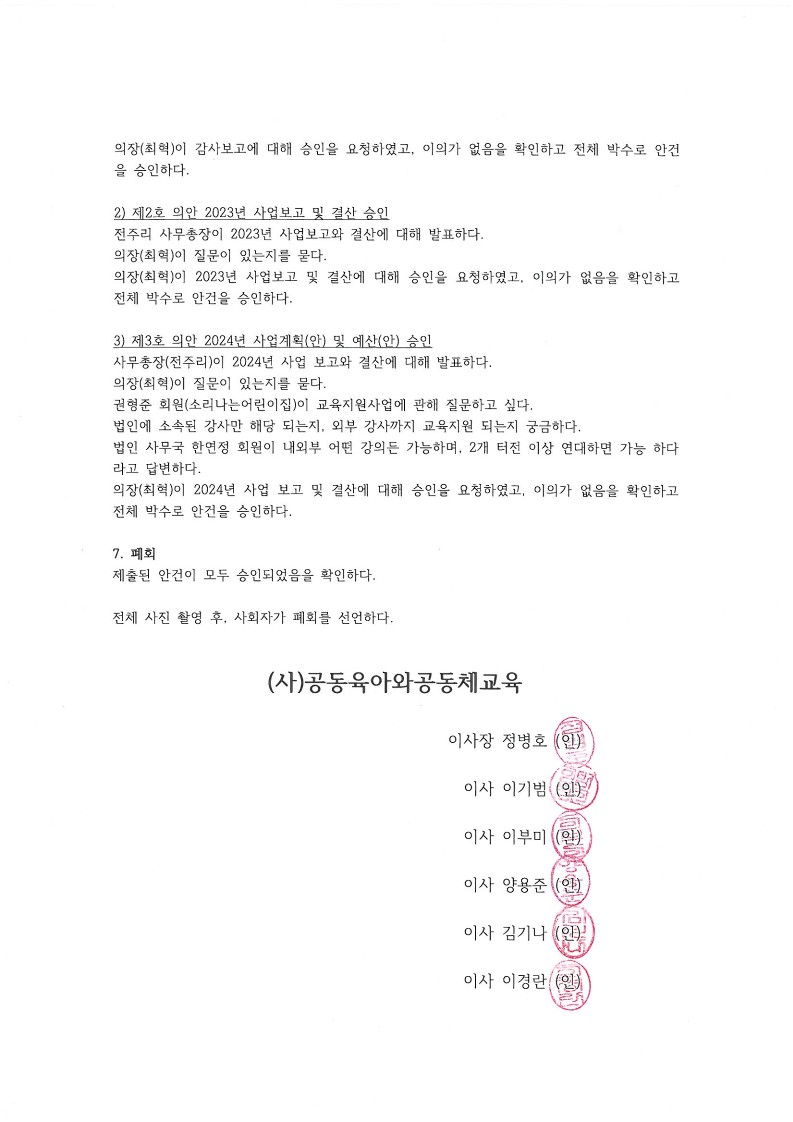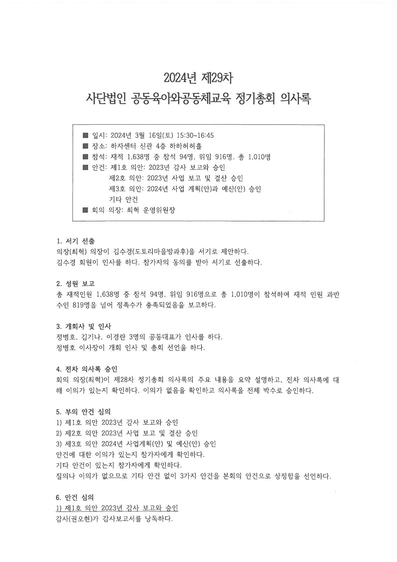 2024년 제29차 (사)공동육아와공동체교육 정기총회 의사록 페이지 정보 작성자 운영자 작성일24-03-26 11:59 조회865회 본문 댓글목록 등록된 댓글이 없습니다. 이전글 다음글 목록