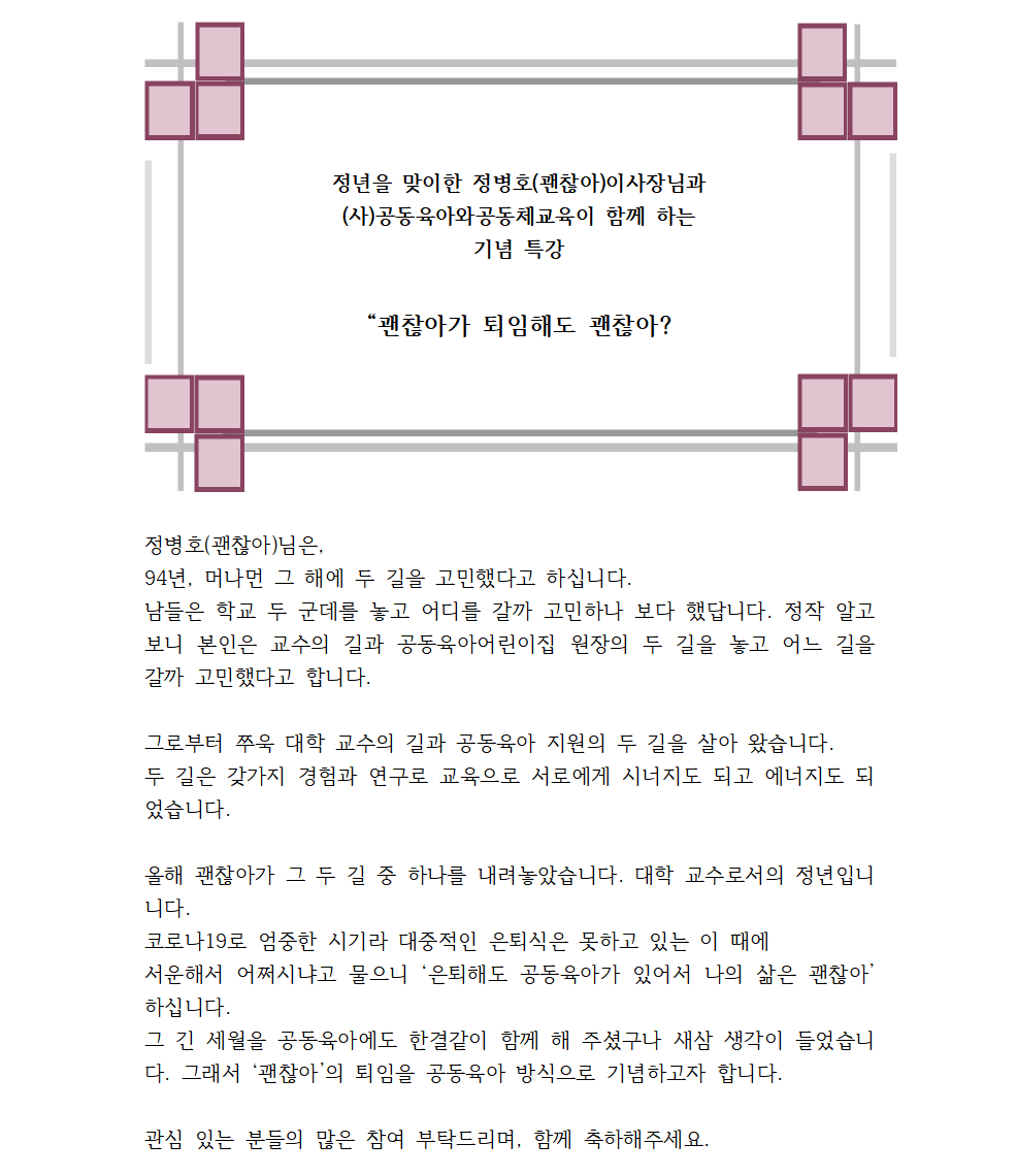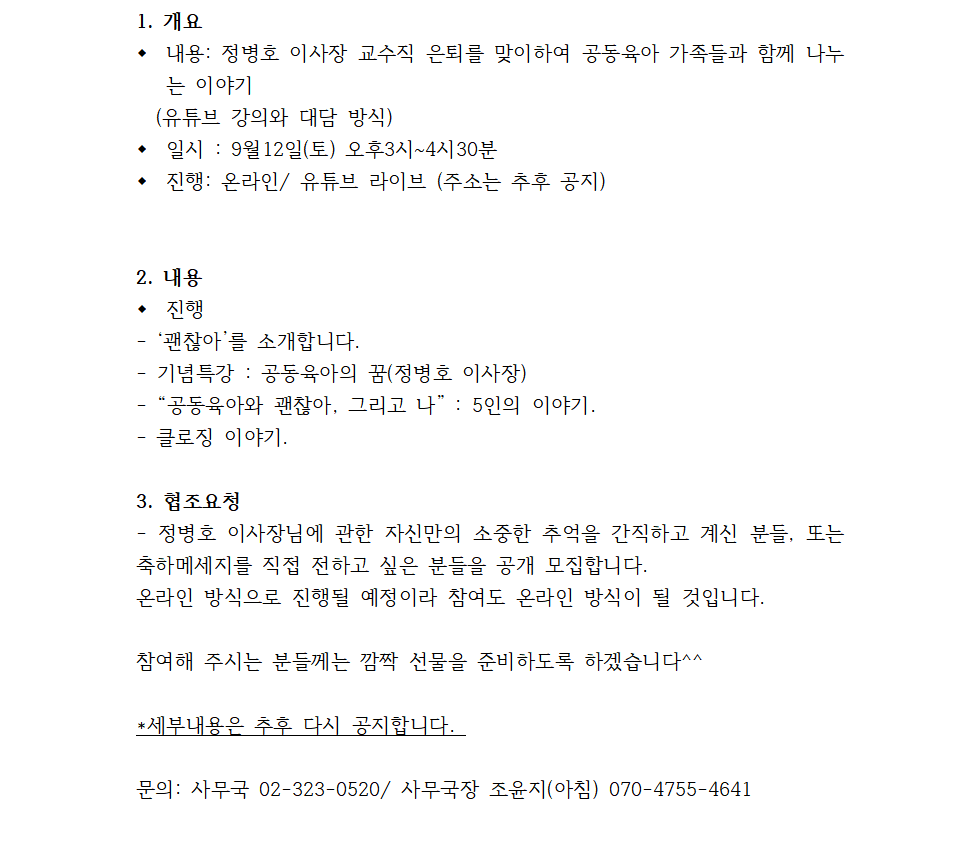 [기념특강] 정년을 맞이한 정병호(괜찮아)이사장님 기념특강--날짜변경됨 확인필