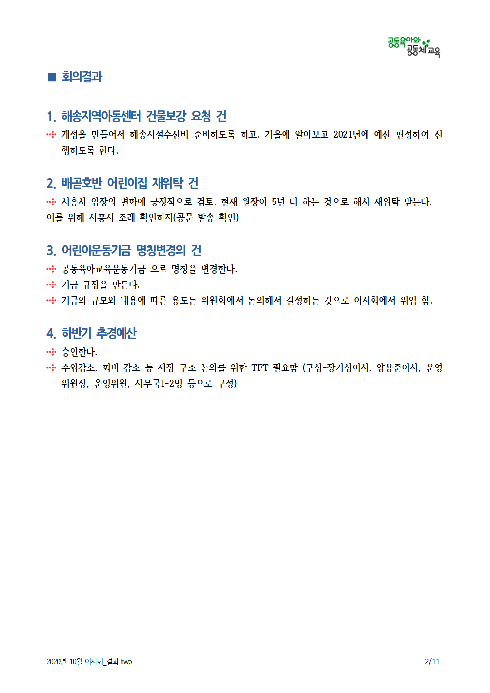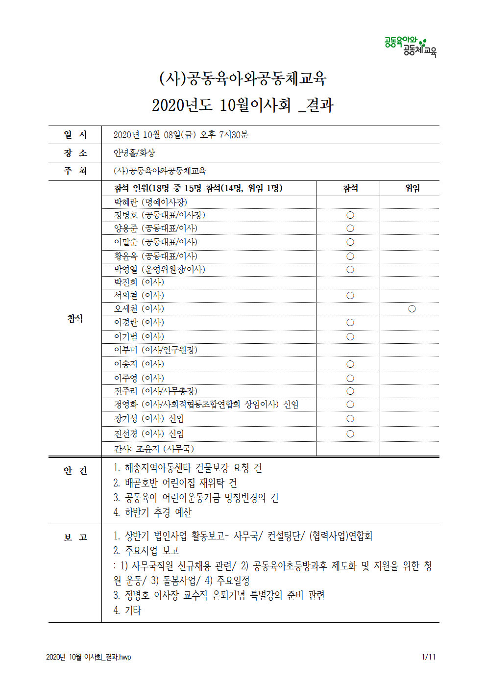 2020년 (사)공동육아와공동체교육 10월 이사회 회의결과
