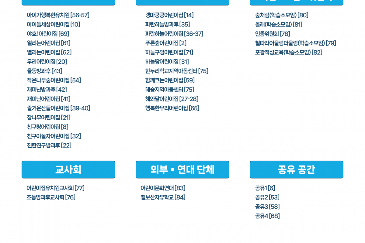 [2025 공동육아 한마당] 제13회 한마당 행사 안내도•터전 부스 배치표 페이지 정보 작성자 운영자 작성일25-09-22 18:16 조회466회 본문 댓글목록 등록된 댓글이 없습니다. 이전글 다음글 목록