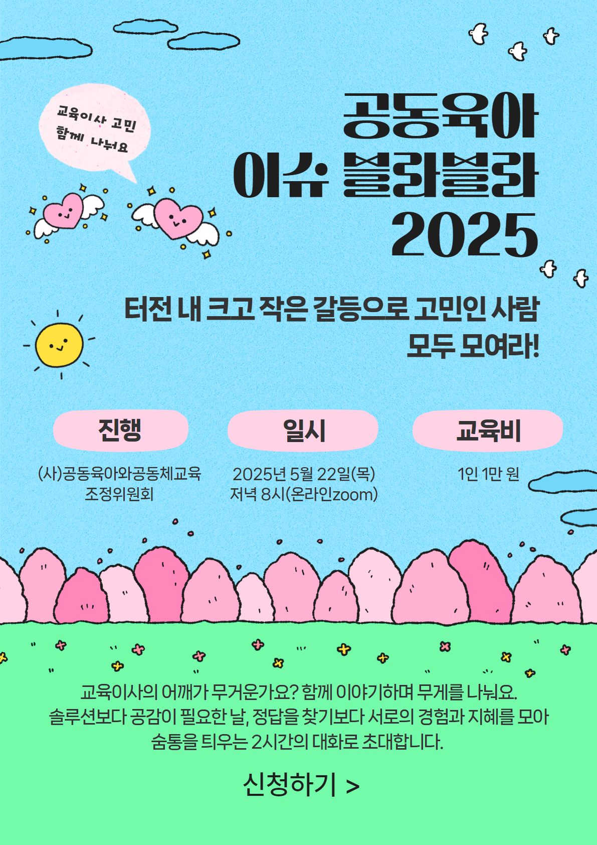 [공동육아 이슈 블라블라] 2025 조정위원회와 함께 하는 교육(터전 내 크고 작은 갈등으로 고민인 사람 모두 모여라) 페이지 정보 작성자 운영자 작성일25-05-02 14:23 조회442회 본문 댓글목록 등록된 댓글이 없습니다. 이전글 다음글 목록