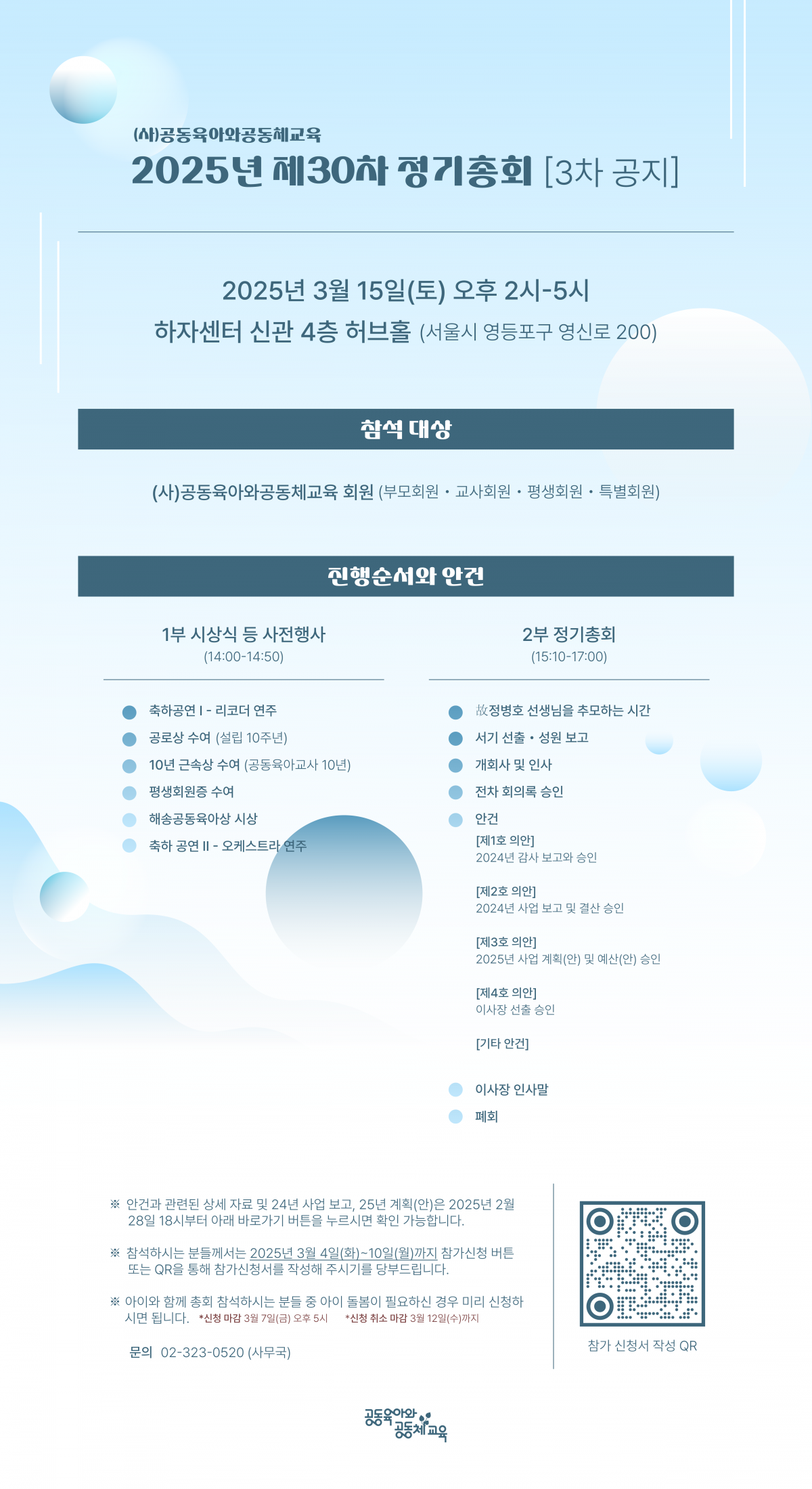 2025년 제30차 사단법인 공동육아와공동체교육 정기총회 3차 안내(참가신청, 사업보고 및 계획 첨부) 페이지 정보 작성자 운영자 작성일25-02-28 09:27 조회968회 본문 댓글목록 등록된 댓글이 없습니다. 이전글 다음글 목록