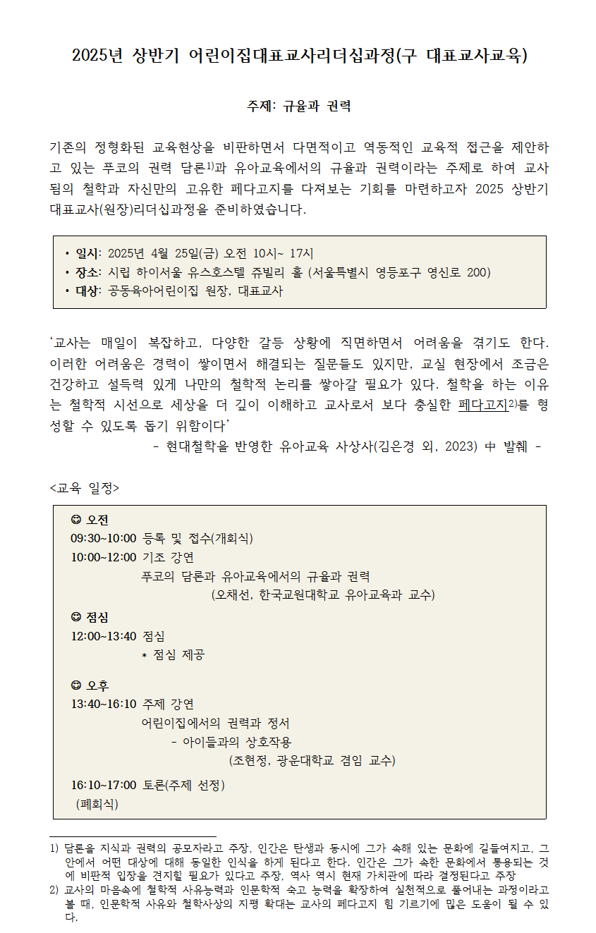 2025 어린이집/유치원 대표교사리더십과정이 열립니다.