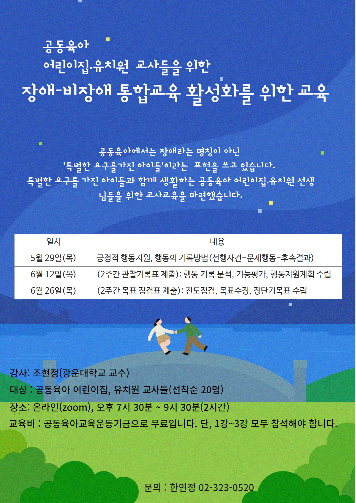 공동육아 어린이집유치원 교사들을 위한 장애-비장애 통합교육 페이지 정보 작성자 운영자 작성일25-04-10 16:06 조회524회 본문 신청하기https://forms.gle/UCyDEfrswGztNZte7 댓글목록 등록된 댓글이 없습니다. 이전글 다음글 목록