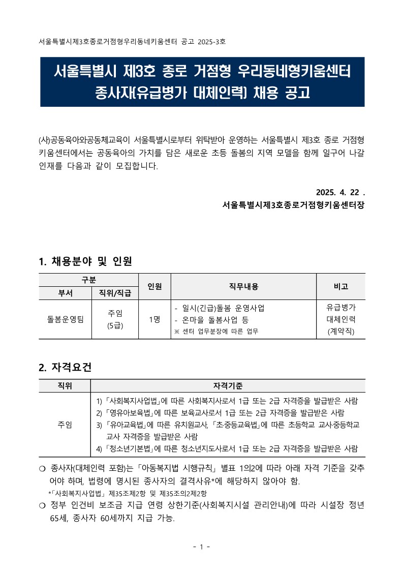 서울특별시 제3호(종로) 거점형 키움센터 종사자 채용 공고(1인, 2개월 대체인력)