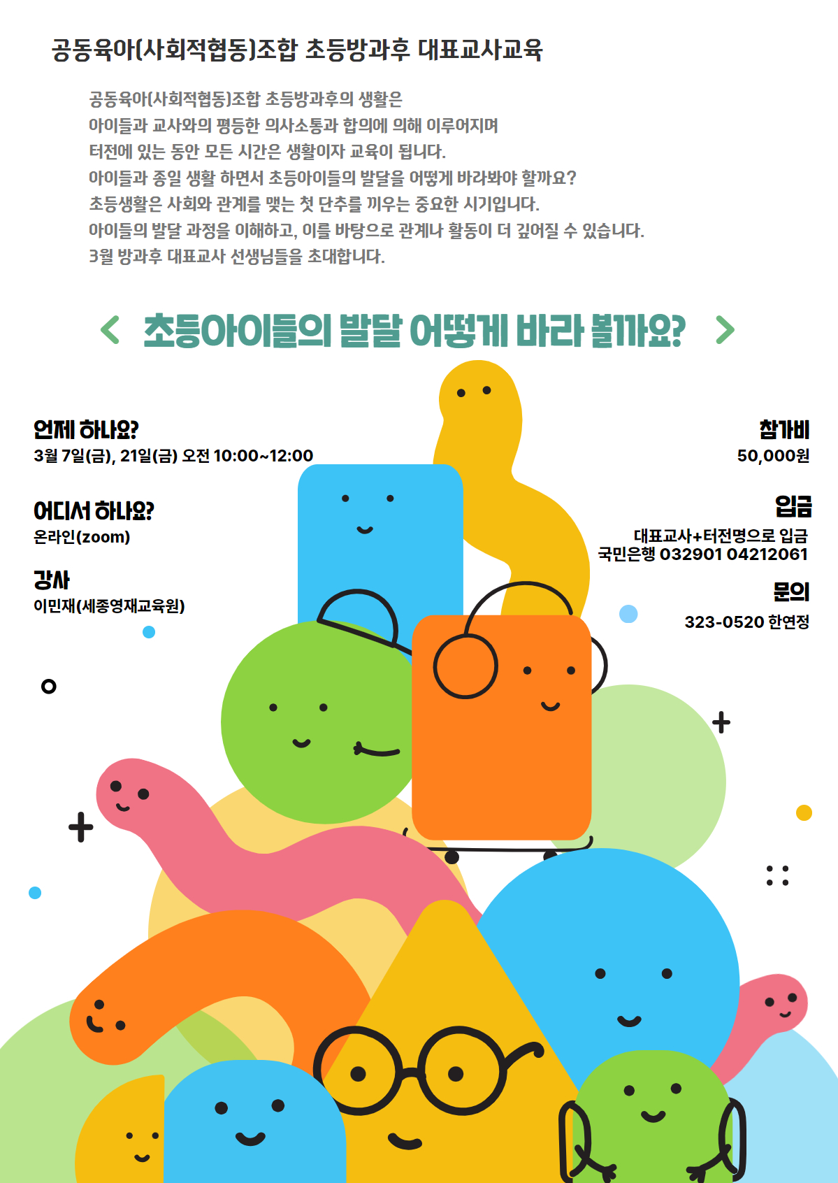 [공동육아교육연구원] 공동육아(사회적협동)조합 초등방과후 대표교사교육 페이지 정보 작성자 운영자 작성일25-02-12 15:06 조회533회 본문 댓글목록 등록된 댓글이 없습니다. 이전글 다음글 목록