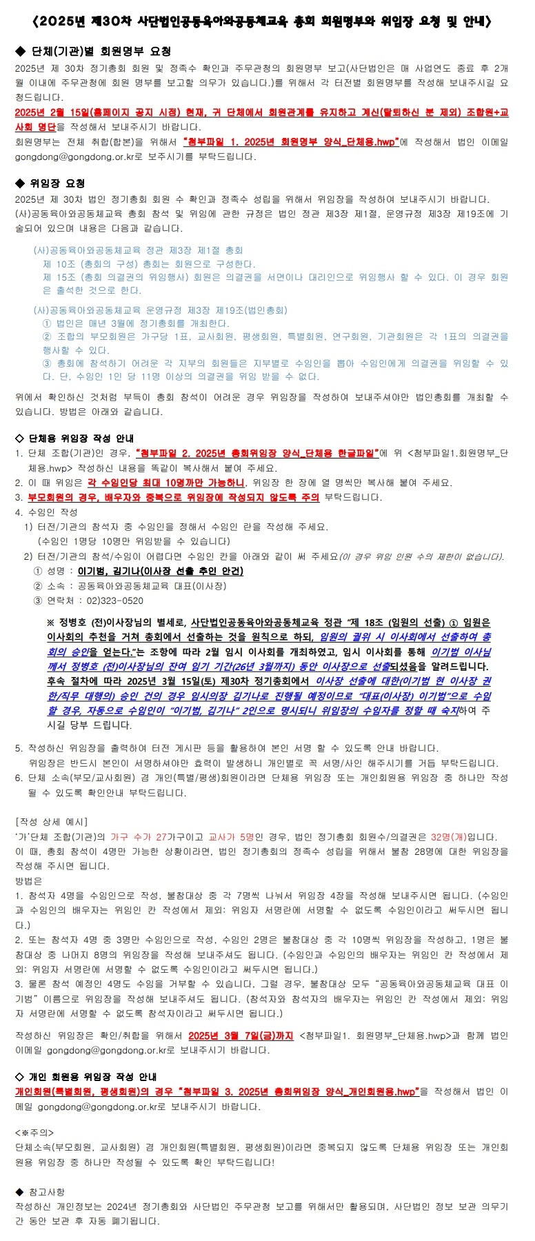 2025년 제30차 사단법인 공동육아와공동체교육 정기총회 2차 안내(회원명부와 위임장 요청)