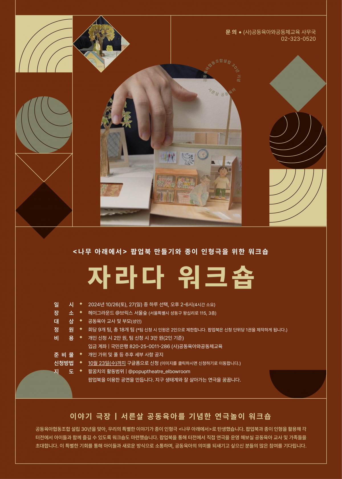 [서른살 공동육아③] '나무 아래에서' 팝업북 만들기와 종이 인형극을 위한 워크숍 안내 페이지 정보 작성자 운영자 작성일24-10-01 11:48 조회1,185회 본문 ▶︎ 워크숍 신청 바로가기(클릭)▶︎ '나무 아래에서' 종이인형극 동영상 보러가기(클릭) 댓글목록 등록된 댓글이 없습니다. 이전글 다음글 목록