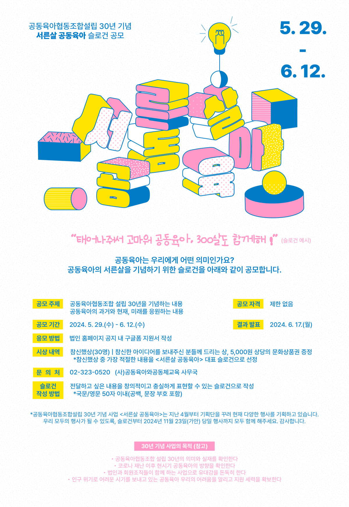 공동육아협동조합설립 30년 기념 <서른살 공동육아> 슬로건을 공모합니다. 페이지 정보 작성자 운영자 작성일24-05-27 15:23 조회1,227회 본문 상단 이미지를 클릭하시거나 하단 링크를 통해 슬로건 지원서로 바로 갈 수 있습니다. 감사합니다.► https://forms.gle/xrV4ePLSBSMqwnoCA 댓글목록 등록된 댓글이 없습니다. 이전글 다음글 목록