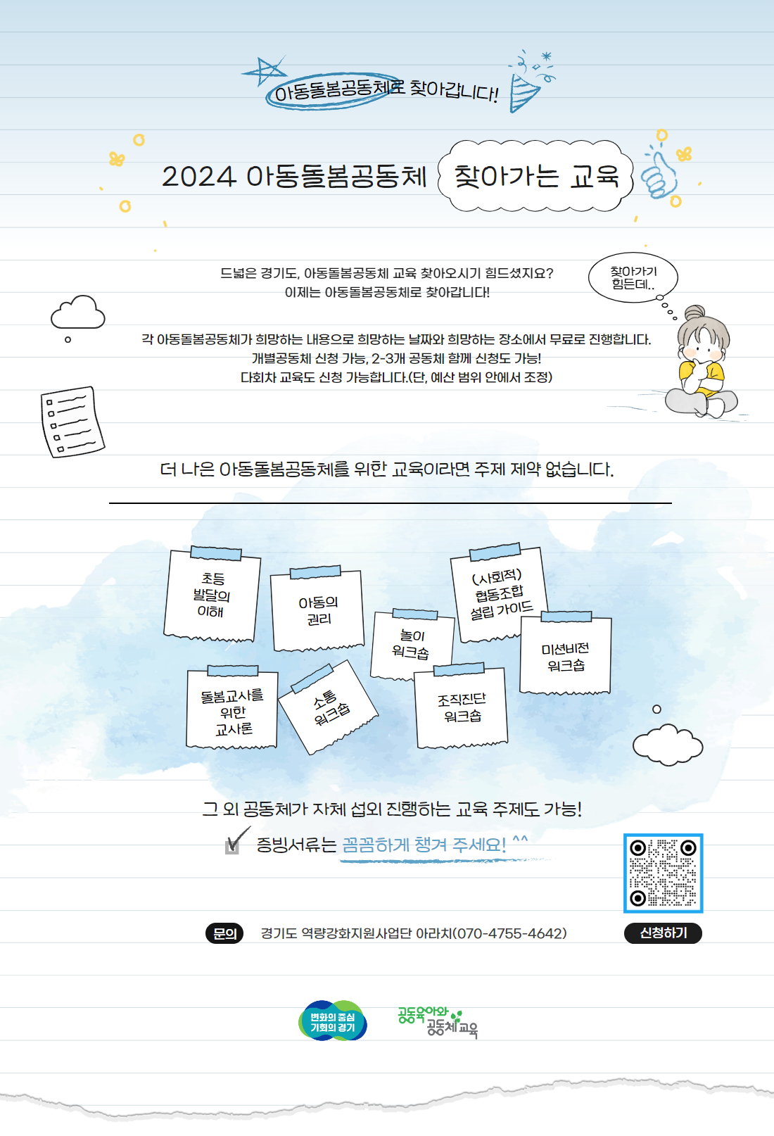 경기도 아동돌봄공동체 2024 찾아가는 교육이 시작됩니다 페이지 정보 작성자 운영자 작성일24-05-31 15:55 조회777회 본문 * 신청은 링크로! https://forms.gle/kirzh9C4SsDN5hGa9 * 문의는 아동돌봄공동체 사업단으로! (아라치) 070-4755-4642 댓글목록 등록된 댓글이 없습니다. 이전글 다음글 목록
