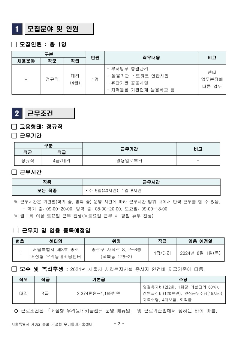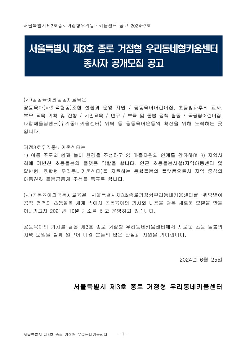 서울특별시 제3호(종로) 거점형 키움센터 종사자 채용 공고(1인)