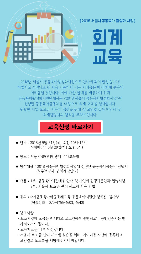 2018 서울시 공동육아 활성화 사업 회계 교육 안내 페이지 정보 작성자 운영자 작성일18-05-02 10:34 조회1,791회 본문 무제 문서 댓글목록 등록된 댓글이 없습니다. 이전글 다음글 목록