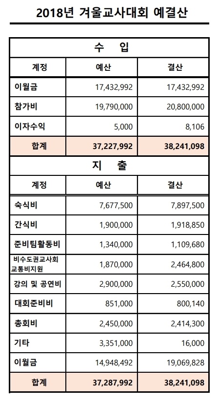 2018년 공동육아 겨울교사대회 회계 보고 페이지 정보 작성자 운영자 작성일18-05-04 16:32 조회1,778회 본문 2018년 1월 19일(금)~20일(토) 진행되었던 겨울교사대회 결산자료를 보고합니다.본 자료는 결산전 사항으로 결산시 변경사항이 발생할 수 있습니다. 댓글목록 등록된 댓글이 없습니다. 이전글 다음글 목록