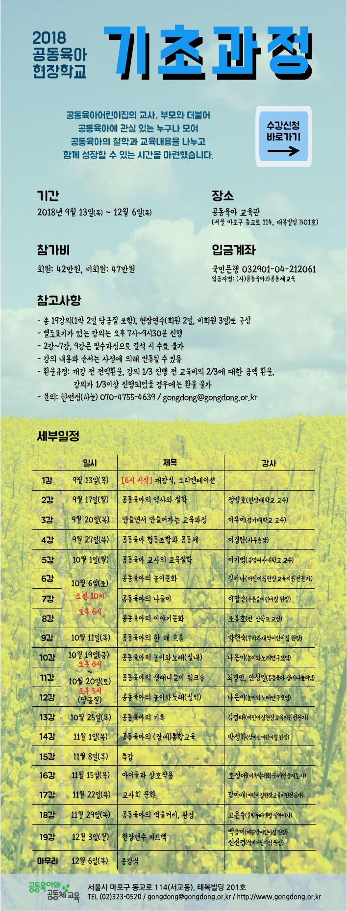 2018년 제63기 공동육아어린이집 현장학교 기초과정 안내 페이지 정보 작성자 운영자 작성일18-08-16 16:20 조회1,384회 본문 무제 문서 댓글목록 등록된 댓글이 없습니다. 이전글 다음글 목록