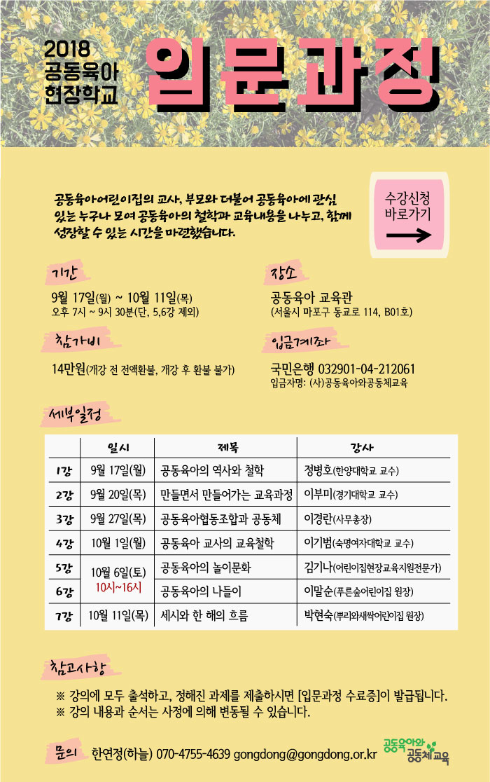 2018년 공동육아어린이집 현장학교 [입문과정] 안내 페이지 정보 작성자 운영자 작성일18-08-20 15:20 조회1,727회 본문 무제 문서 댓글목록 등록된 댓글이 없습니다. 이전글 다음글 목록