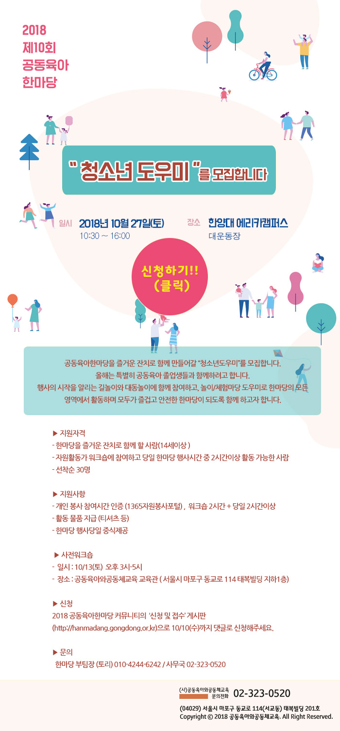 2018 공동육아한마당 - 청소년도우미를 모집합니다. 페이지 정보 작성자 운영자 작성일18-10-04 11:44 조회1,509회 본문 댓글목록 등록된 댓글이 없습니다. 이전글 다음글 목록