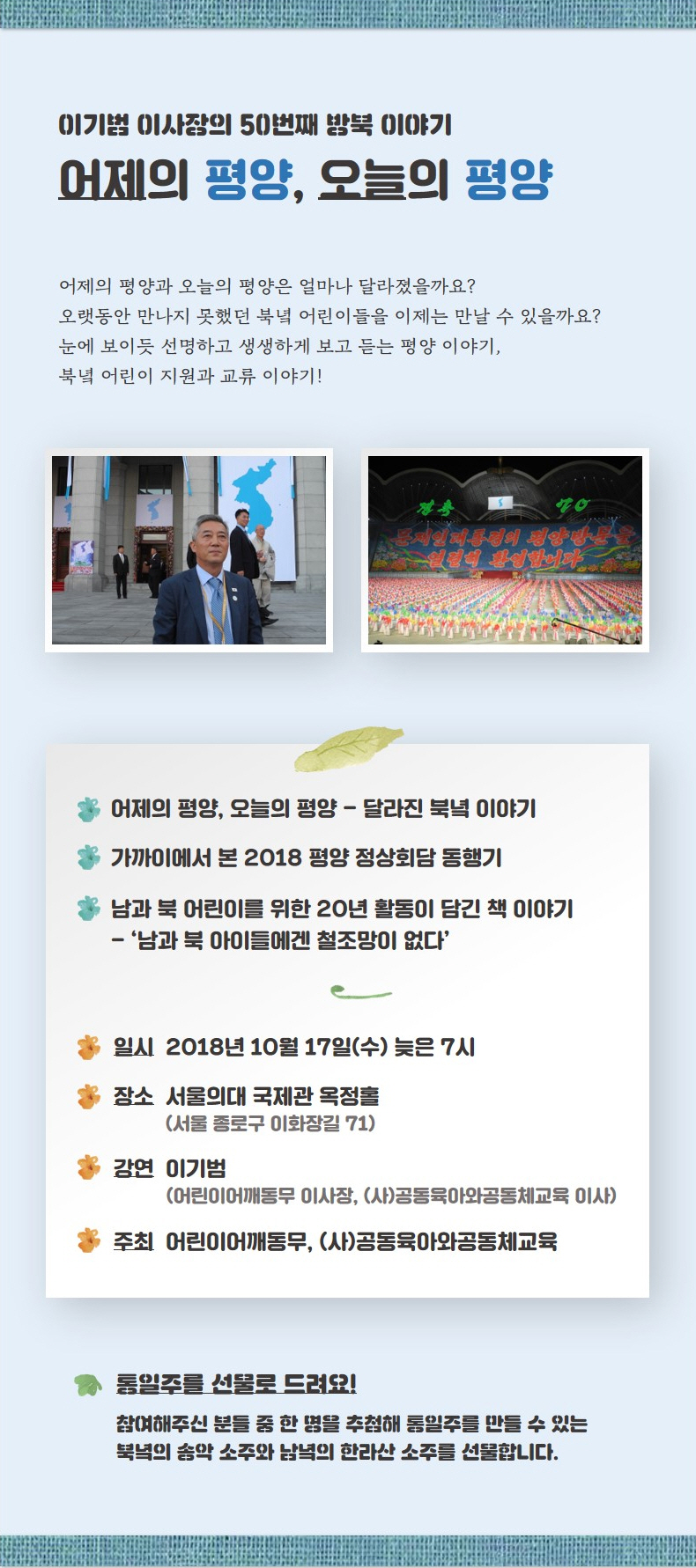 <어제의 평양, 오늘의 평양>_ 이기범 이사님의 방북이야기 페이지 정보 작성자 사무국 작성일18-10-10 09:03 조회1,033회 본문 참가신청하기 클릭 댓글목록 등록된 댓글이 없습니다. 이전글 다음글 목록