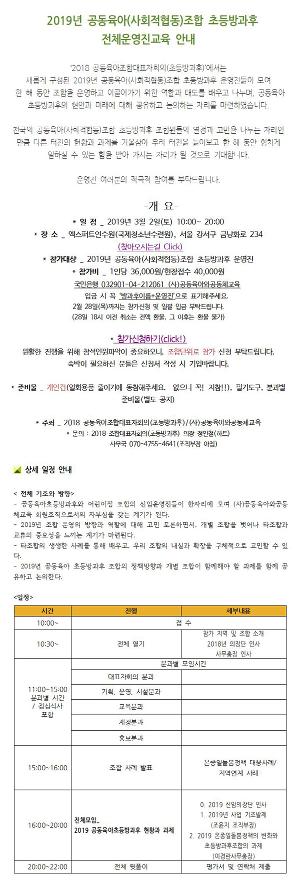 2019년 공동육아(사회적협동)조합 초등방과후 전체운영진교육 안내 페이지 정보 작성자 운영자 작성일19-02-08 10:06 조회1,546회 본문 무제 문서 댓글목록 등록된 댓글이 없습니다. 이전글 다음글 목록
