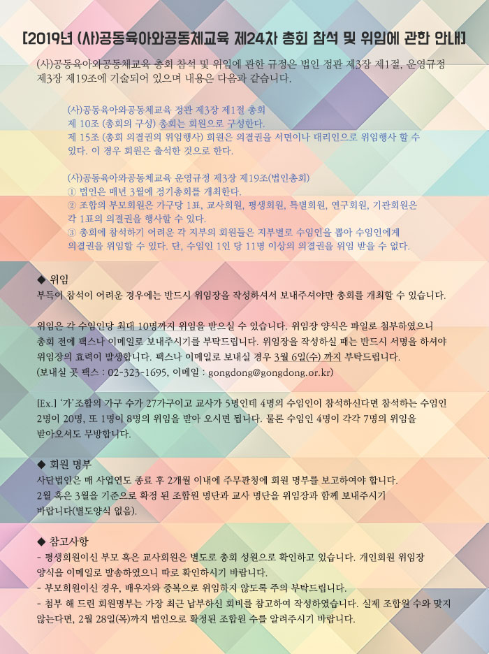 [2019년] 제24회 (사)공동육아와공동체교육 정기총회 참석 및 위임에 관한 안내(총회일자 3월 9일)