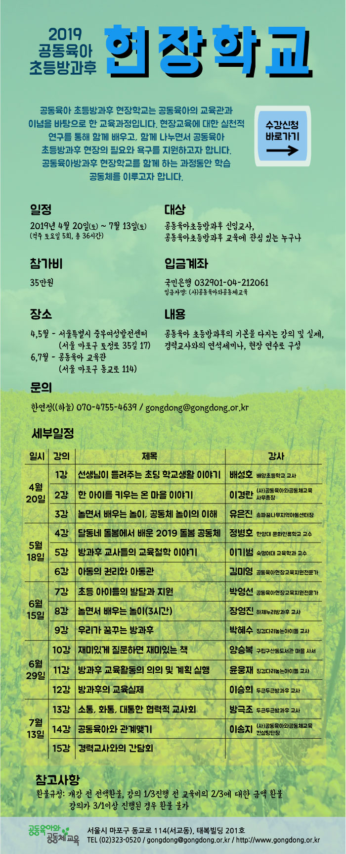 2019년 공동육아초등방과후 현장학교 안내 페이지 정보 작성자 운영자 작성일19-03-18 11:34 조회1,962회 본문 댓글목록 사무국님의 댓글 사무국 작성일 19-03-26 13:38 * 강의 시간은 오전 10시~오후 5시까지 입니다. <p><span style="font-size: 14pt;"><strong>* 강의 시간은 오전 10시~오후 5시까지 입니다.</strong></span></p><p> </p> 이전글 다음글 목록