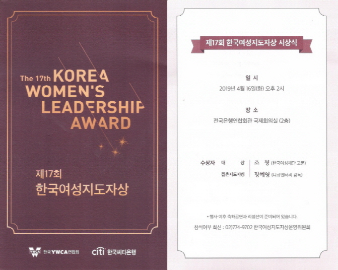 제17회 한국여성지도자상 대상에 조형 선생님께서 선정되셨습니다.