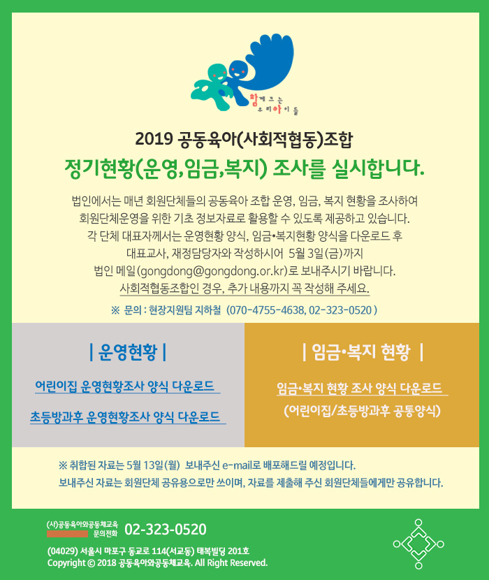 2019 공동육아(사회적협동)조합 정기현황(운영,임금,복지)조사를 실시합니다. (5/10 까지)
