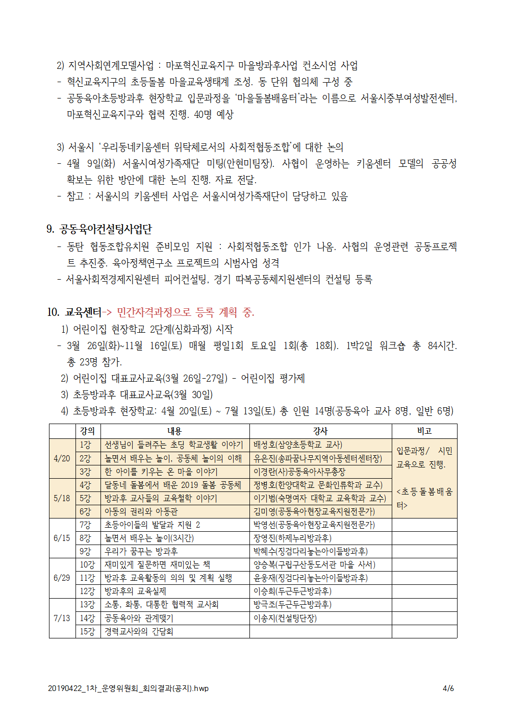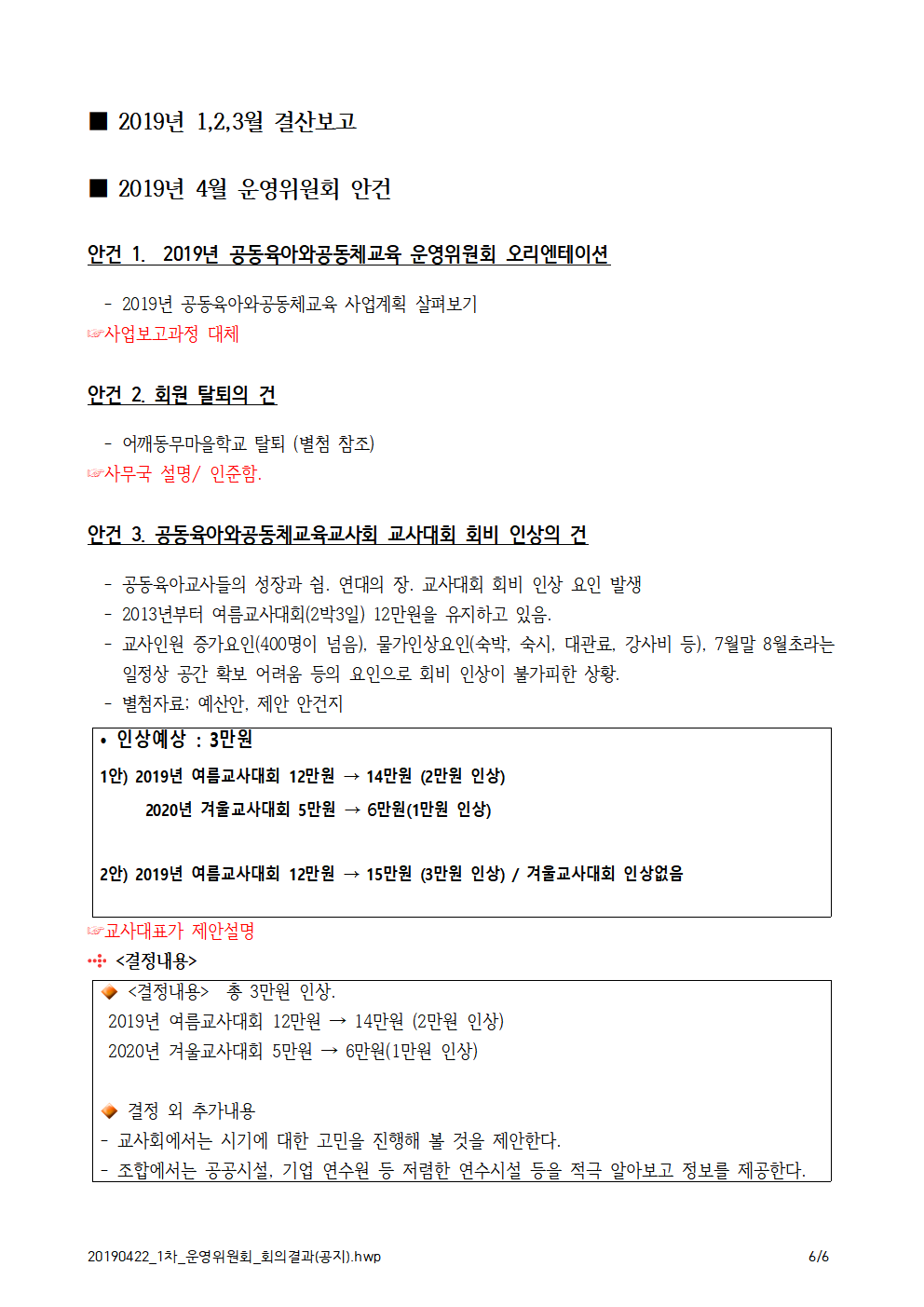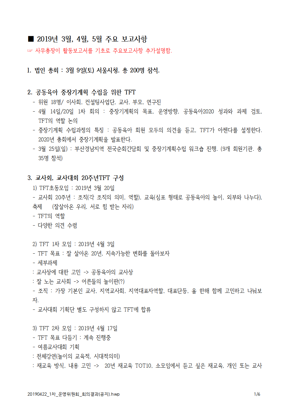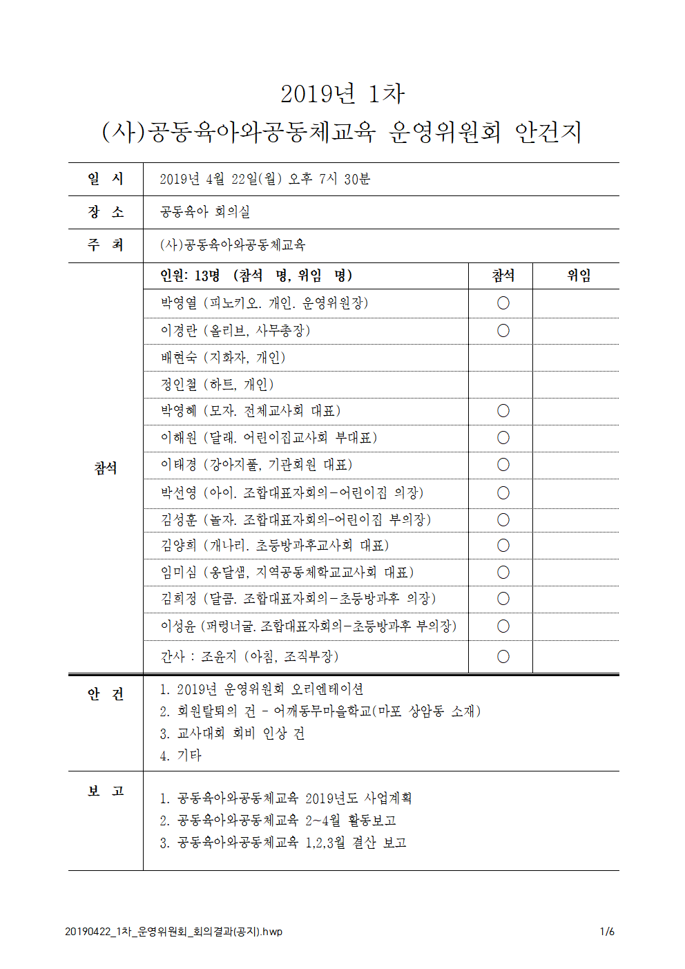 (사)공동육아와공동체교육 2019년도 1차 운영위원회 회의록을 첨부합니다.