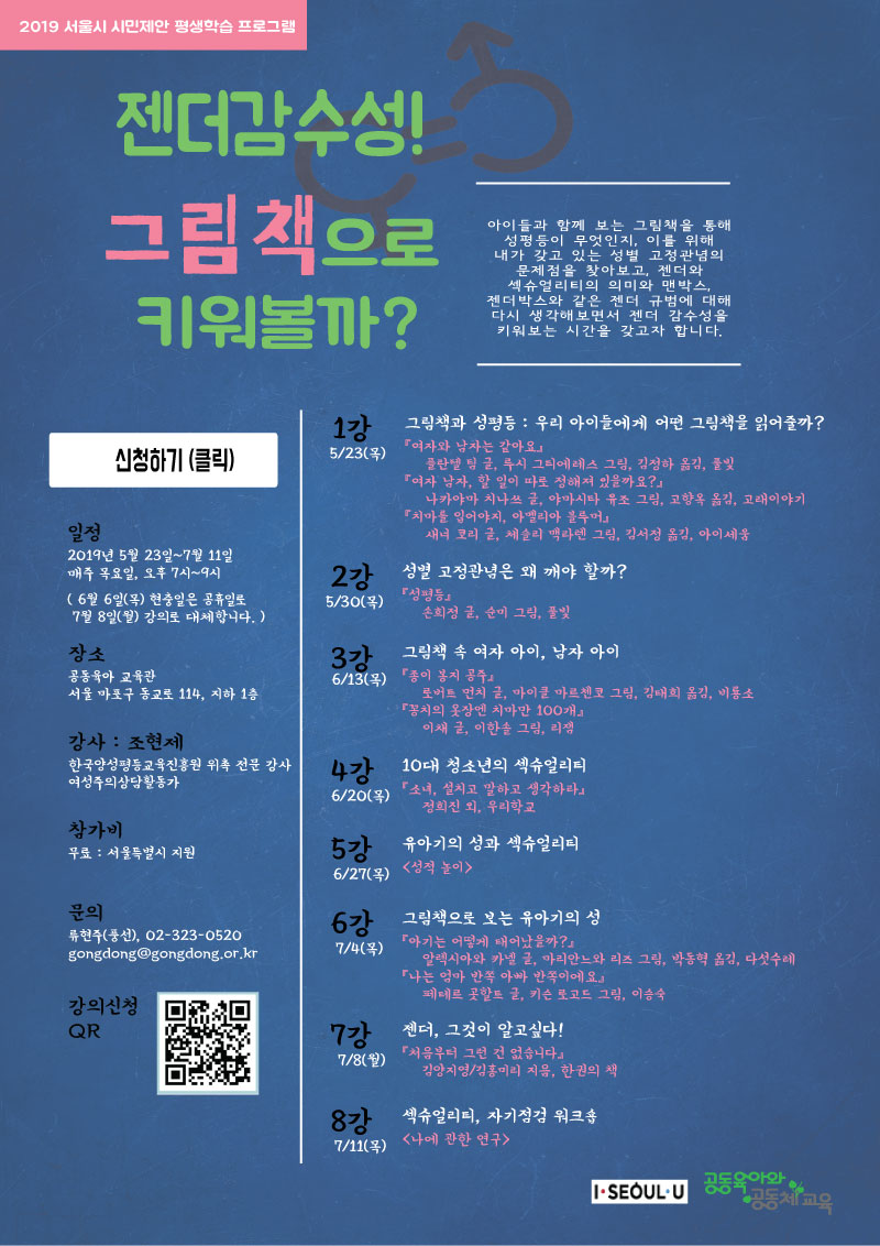 마감-[성교육 세미나] 젠더감수성! 그림책으로 키워볼까 ?(포용적 감수성을 높이는 시민교육 '더불어') 페이지 정보 작성자 운영자 작성일19-04-30 08:29 조회1,942회 본문 댓글목록 등록된 댓글이 없습니다. 이전글 다음글 목록