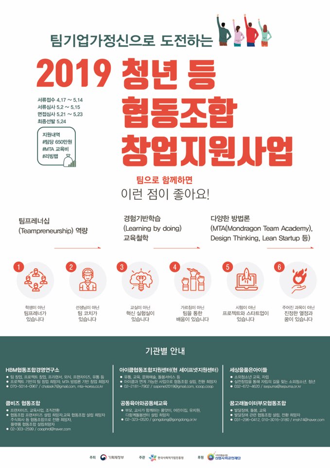 [추가모집] 한국사회적기업진흥원 '2019년 청년 등 협동조합 창업지원사업' 참여 안내