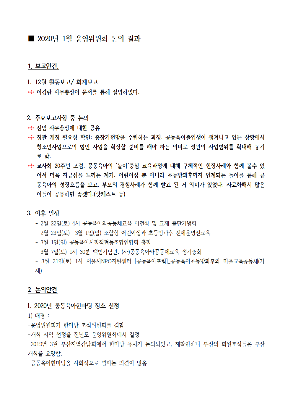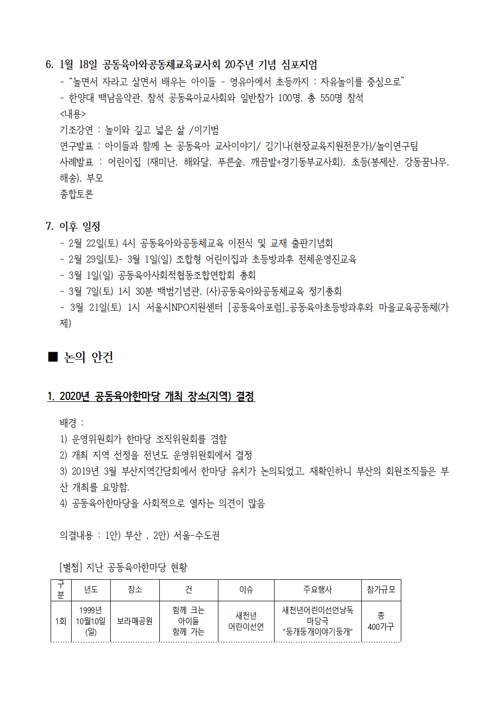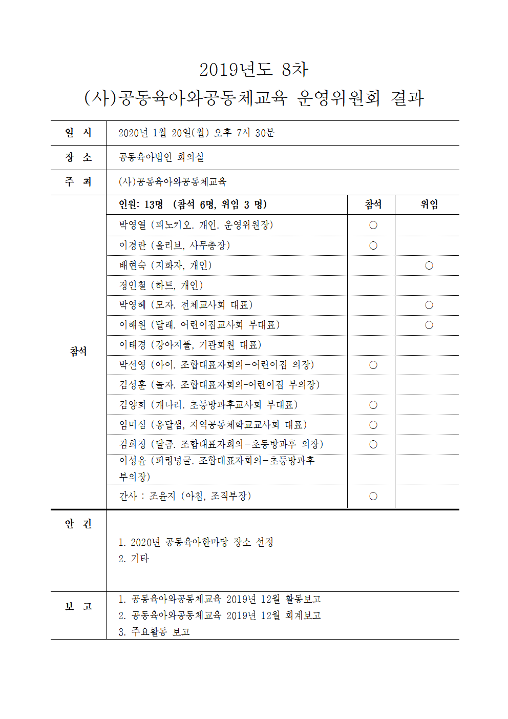 (사)공동육아와공동체교육 2019년 8차 운영위원회 회의 결과