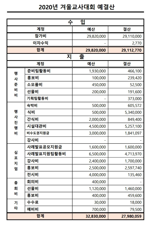 2020년 공동육아 겨울교사대회 회계 보고 페이지 정보 작성자 운영자 작성일20-04-01 13:12 조회1,142회 본문 2020년 1월 17일(금)~18일(토) 진행되었던 2020 공동육아와공동체교육 겨울교사대회 결산을 보고합니다. 댓글목록 등록된 댓글이 없습니다. 이전글 다음글 목록