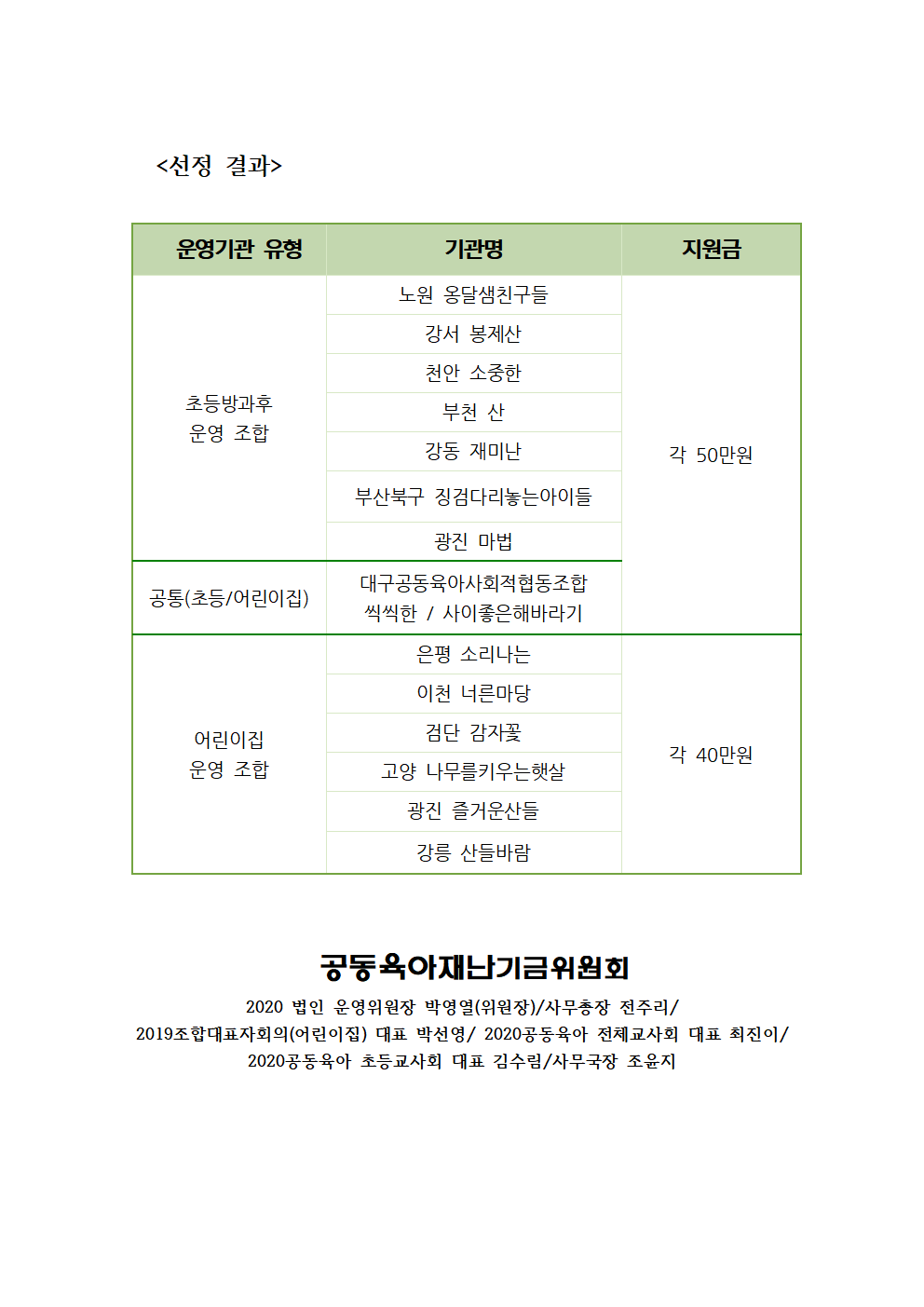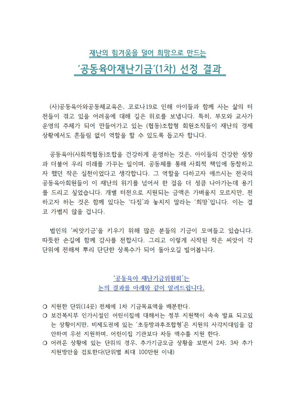 [공동육아재난기금위원회] 재난기금 1차 대상을 공지합니다.