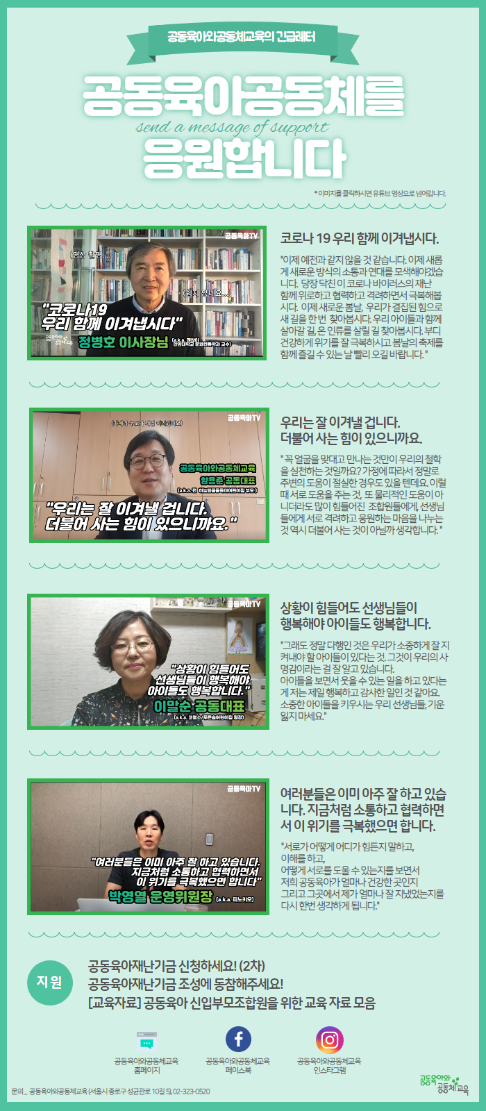 [특별편] e-공동육아 긴급레터. 공동육아공동체를 응원합니다. 페이지 정보 작성자 운영자 작성일20-04-27 15:43 조회1,384회 본문 Untitled Document 댓글목록 등록된 댓글이 없습니다. 이전글 다음글 목록