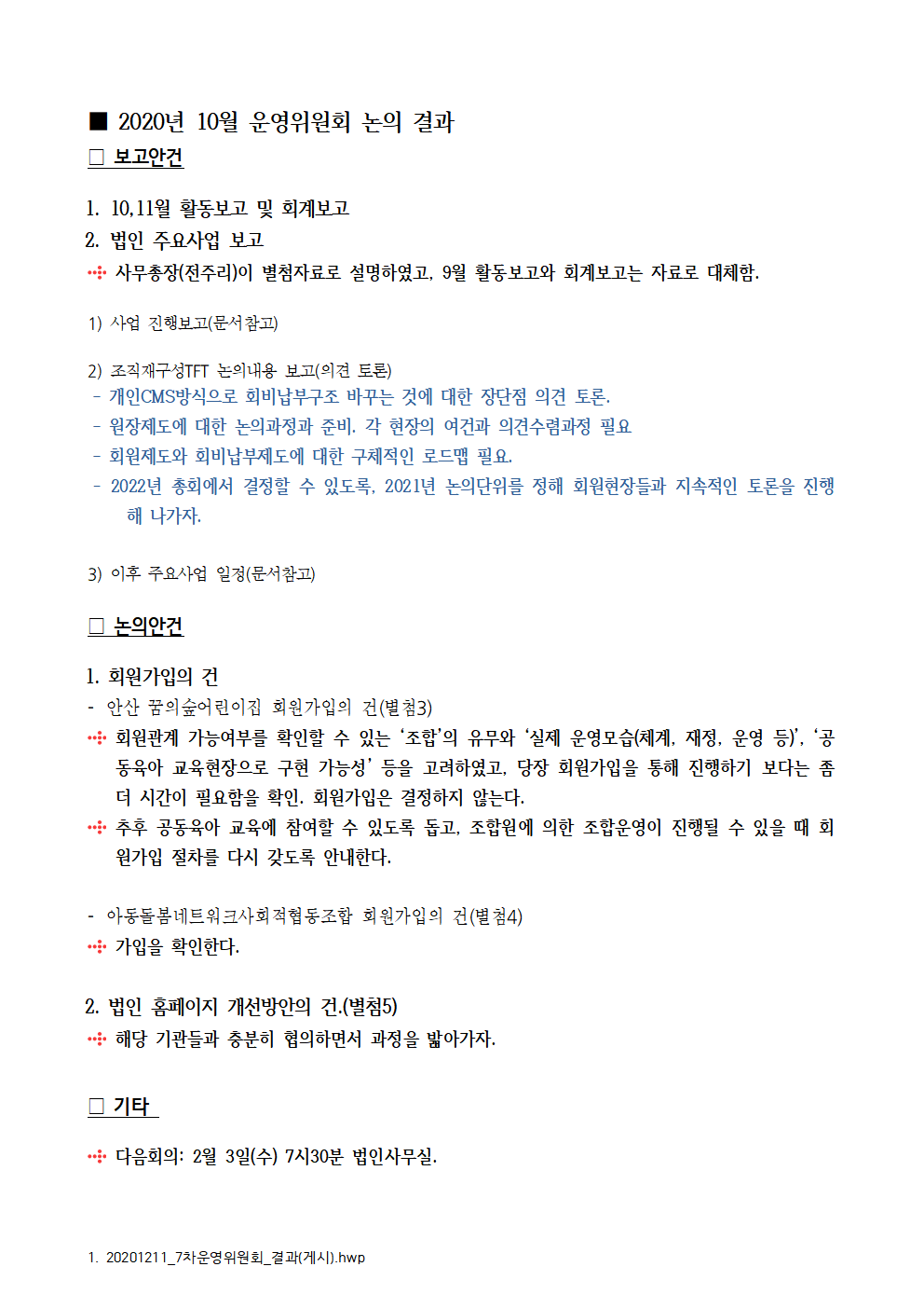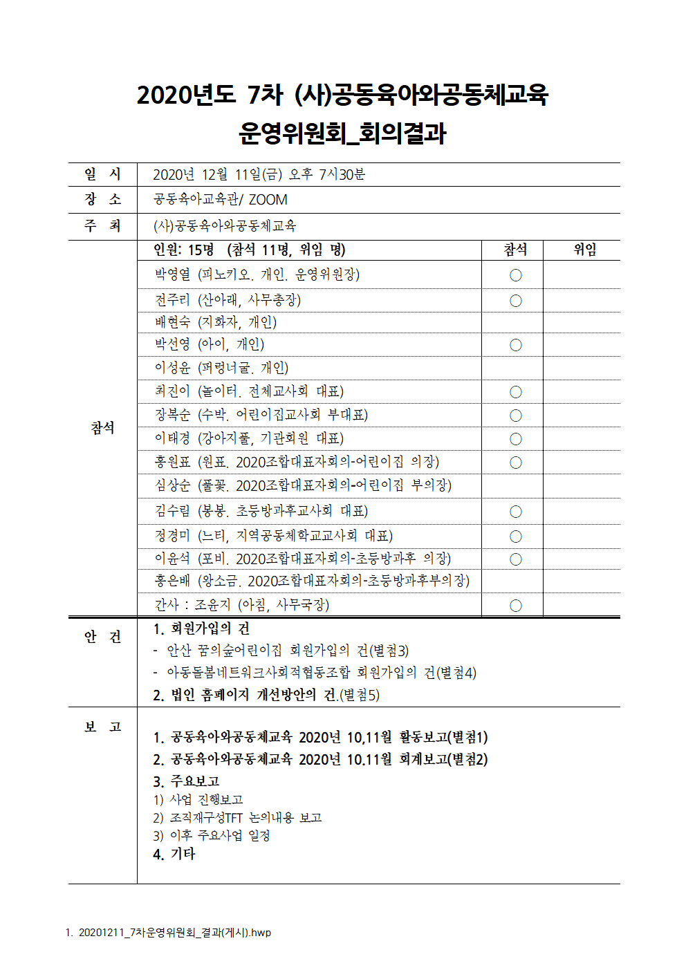 (사)공동육아와공동체교육 2020년 7차 운영위원회_회의 결과