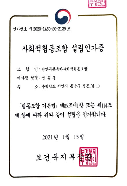 (신나는공동육아사회적협동조합 인가증은 아직 도착하지 않아서 추후 업뎃하겠습니다)
