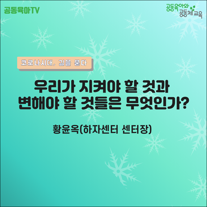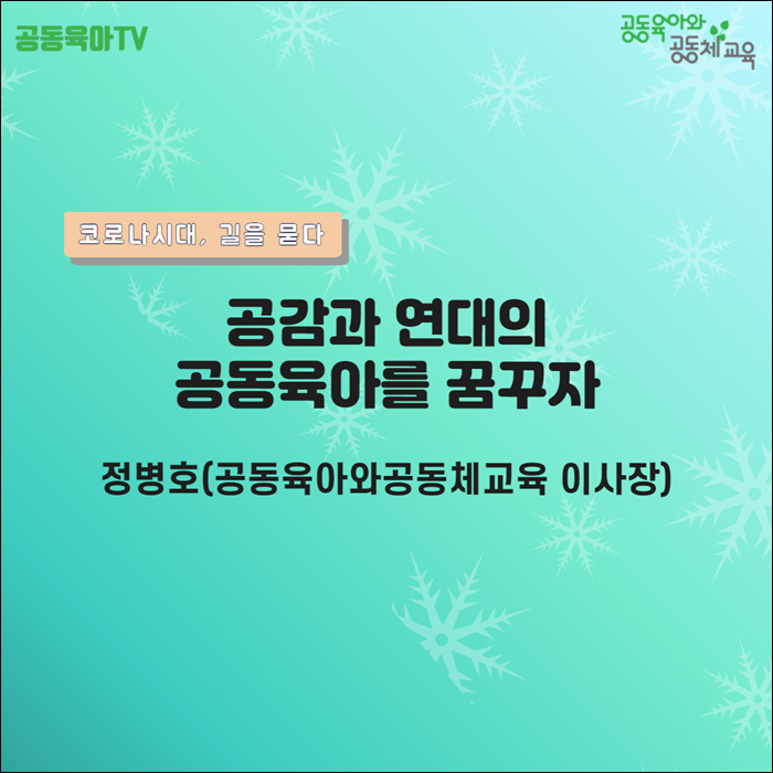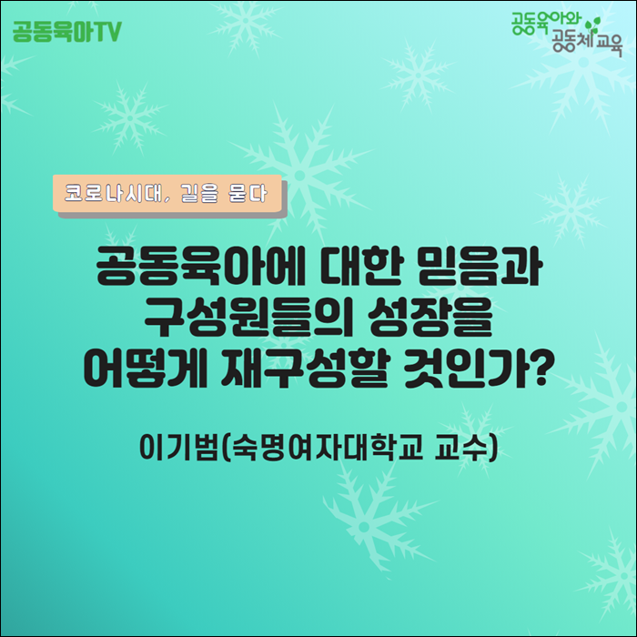 2021년공동육아겨울교사대회 전체강연 '코로나시대, 길을 묻다'가 공개되었습니다. 페이지 정보 작성자 운영자 작성일21-02-19 19:33 조회1,798회 본문 많은 분들이 문의해주셨던 2021년공동육아겨울교사대회 전체강연 '코로나시대, 길을 묻다'가 YOUTUBE '공동육아와공동체교육' 채널을 통해 공개 되었습니다. O. 공동육아에 대한 믿음과 구성원들의 성장을 어떻게 재구성할 것인가? / 이기범(숙명여자대학교 교수)O 우리가 지켜야 할 것과 변해야 할 것들은 무엇인가? / 황윤옥(하자센터 센터장)O. 공감과 연대의 공동육아를 꿈꾸자 / 정병호(공동육아와공동체교육 이사장) 아래 이미지를 누르시면 각 강의로 바로 연결됩니다. :) 댓글목록 등록된 댓글이 없습니다. 이전글 다음글 목록