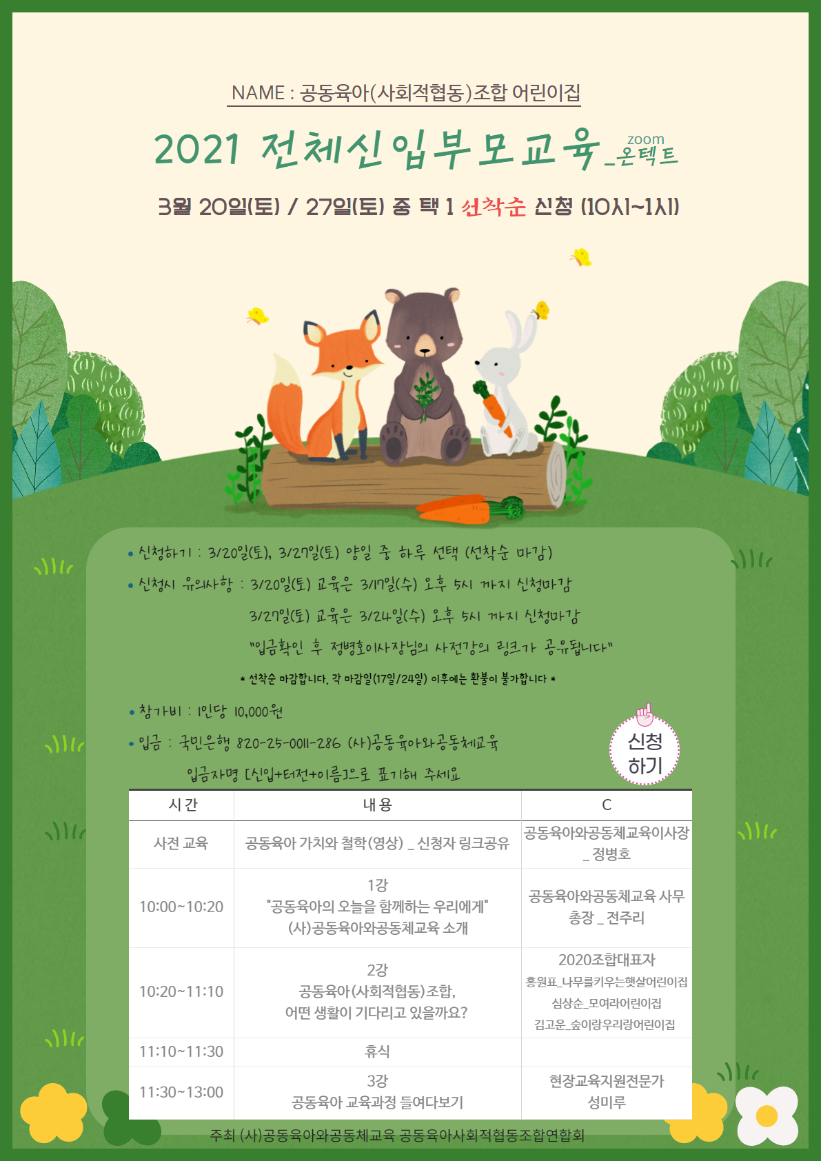 2021 공동육아(사회적협동)조합 어린이집 신입부모교육 안내 페이지 정보 작성자 운영자 작성일21-02-22 15:26 조회2,328회 본문 댓글목록 등록된 댓글이 없습니다. 이전글 다음글 목록