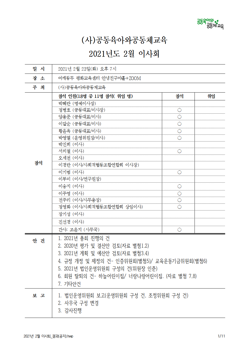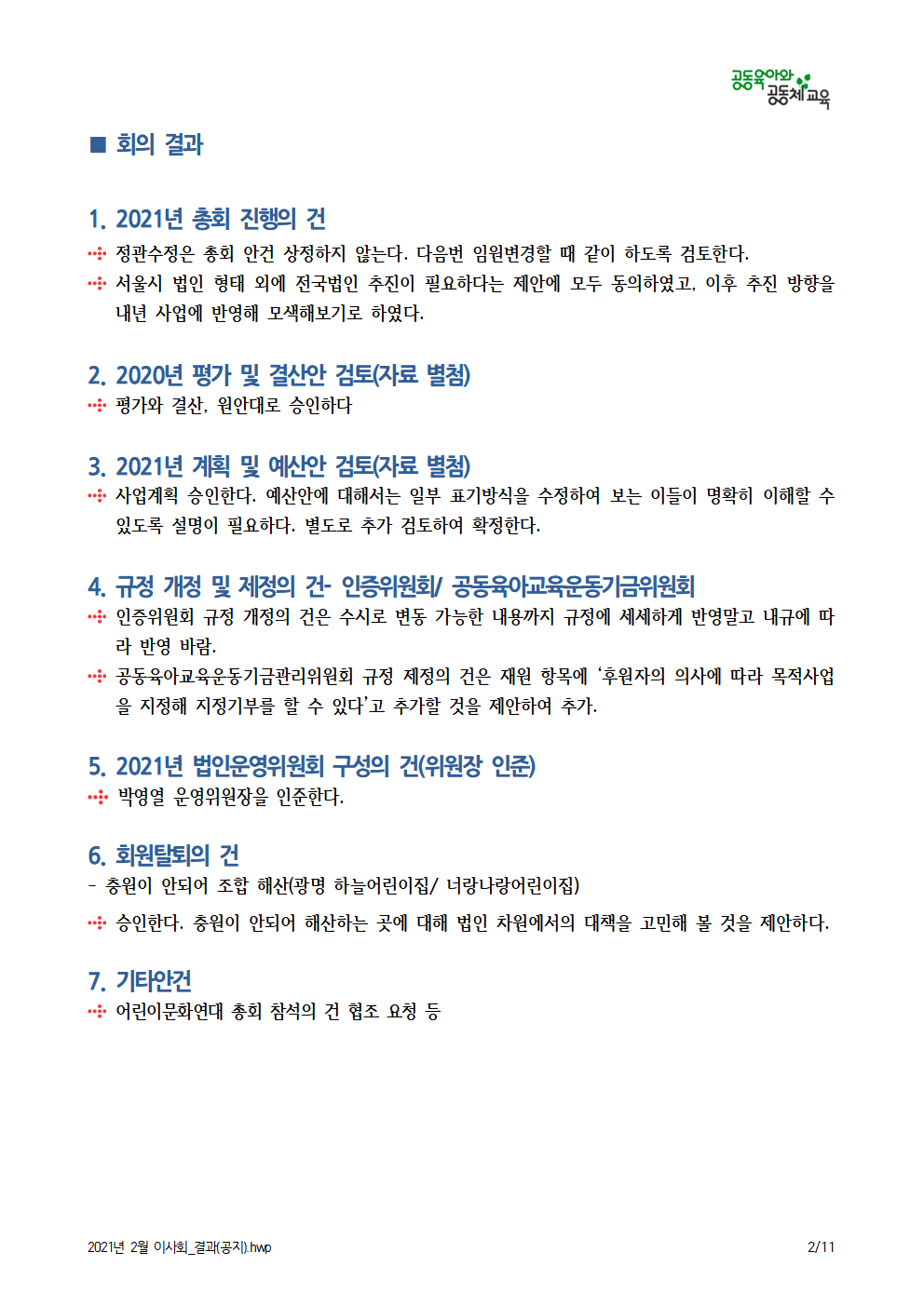 (사)공동육아와공동체교육 2021년 2월 이사회 결과