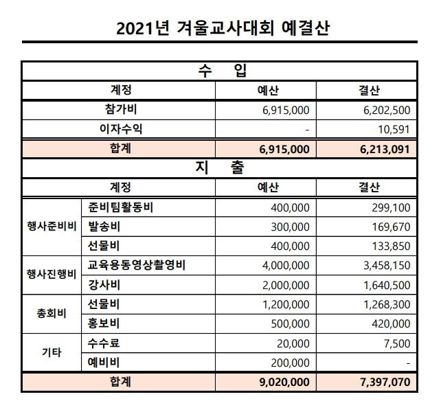 2021년 공동육아 겨울교사대회 회계 보고 페이지 정보 작성자 운영자 작성일21-03-08 16:08 조회1,441회 본문 2021년 1월 23일(토) 진행되었던 공동육아 겨울교사대회 결산 자료를 공지합니다. 댓글목록 등록된 댓글이 없습니다. 이전글 다음글 목록