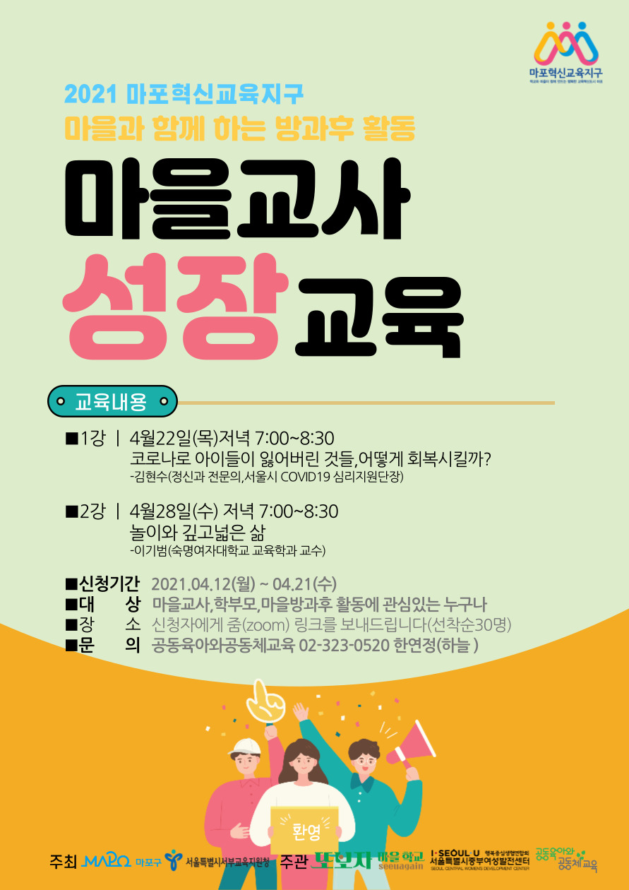 2021년 마포혁신교육지구 마을과 함께하는 방과후 활동 마을교사 성장교육을 법인과 함께 온라인 열린강좌로 진행합니다.