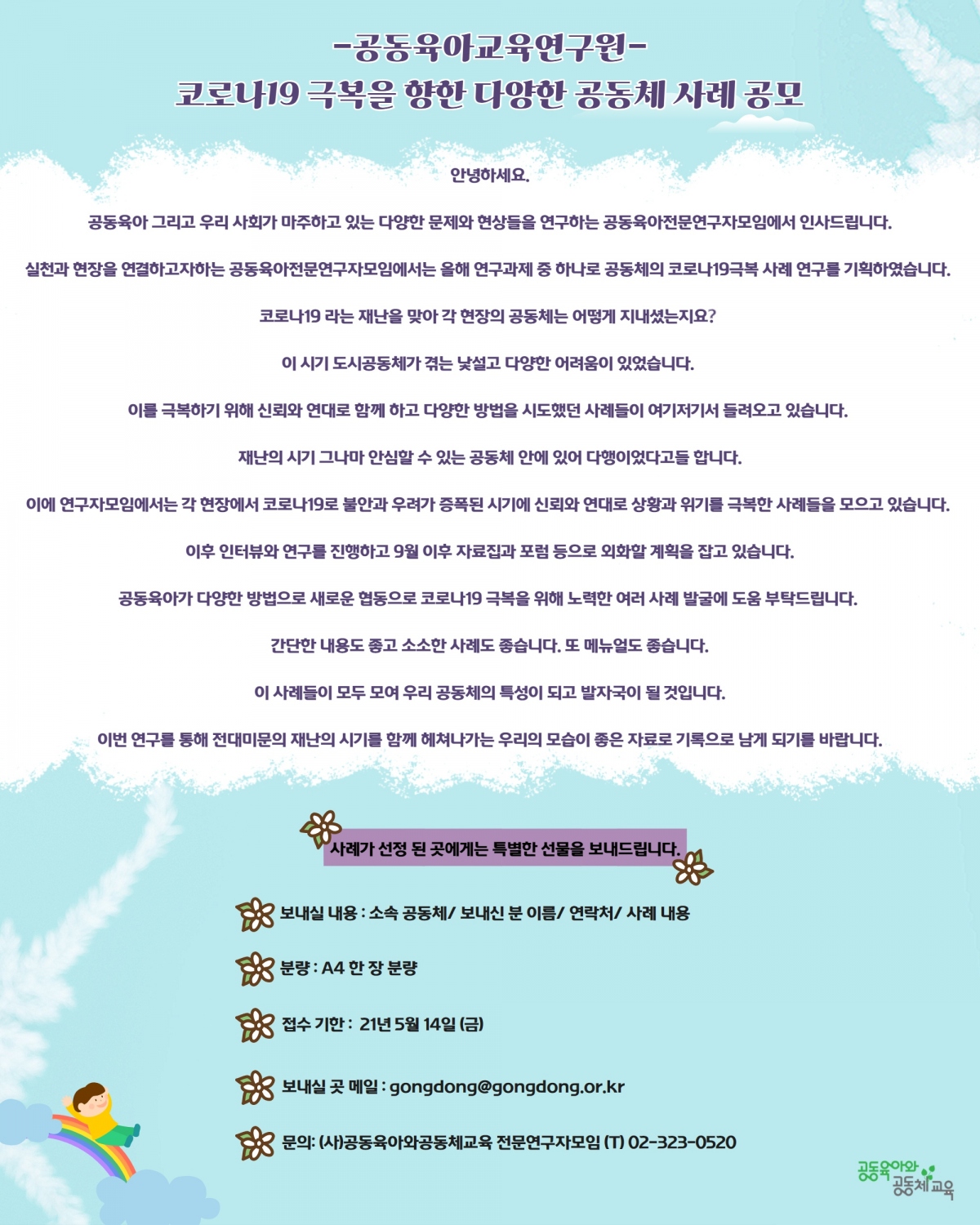 [공동육아교육연구원] 공동육아전문연구자모임 '코로나19 극복을 향한 다양한 공동체 사례 공모' 페이지 정보 작성자 운영자 작성일21-04-30 14:08 조회1,255회 본문 댓글목록 등록된 댓글이 없습니다. 이전글 다음글 목록