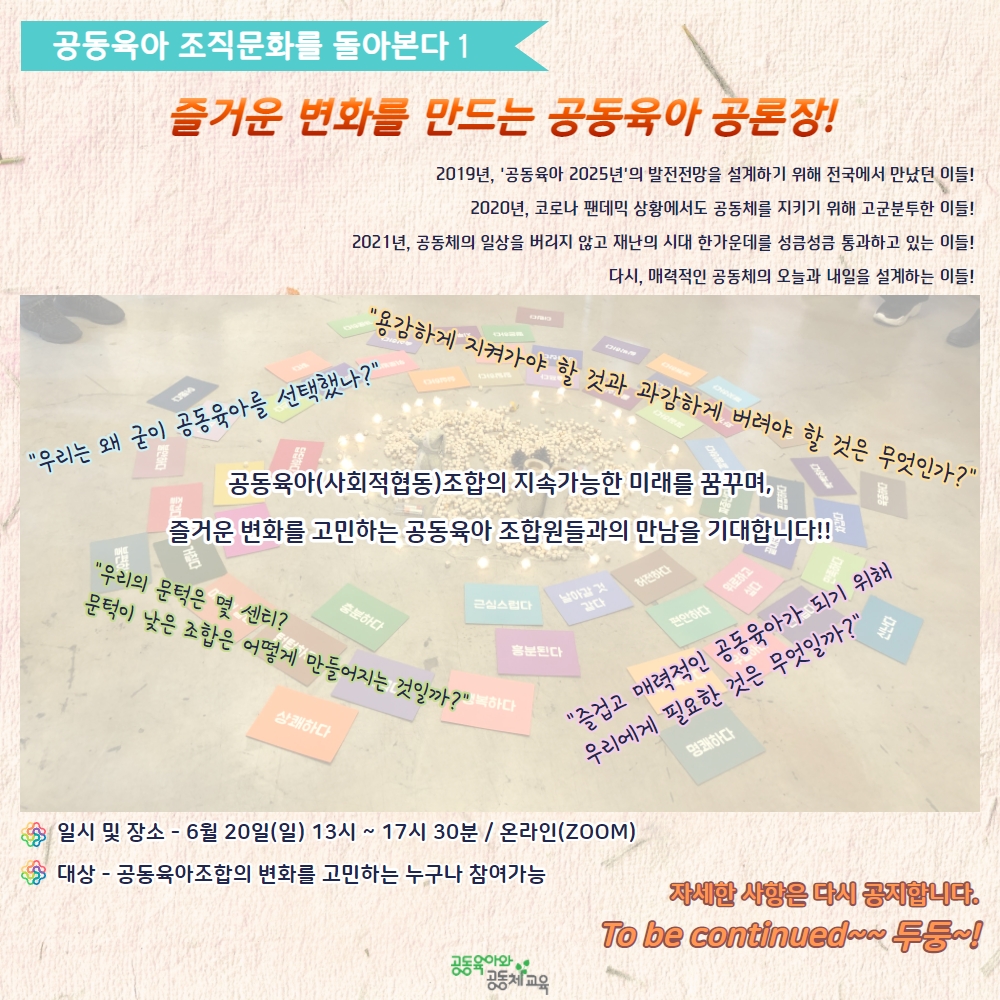 공동육아(사회적협동)조합의 문화를 돌아보고, 한걸음 더 나아가기 위한 우리의 과제에 대해 '공론의 장'을 준비하고 있습니다.