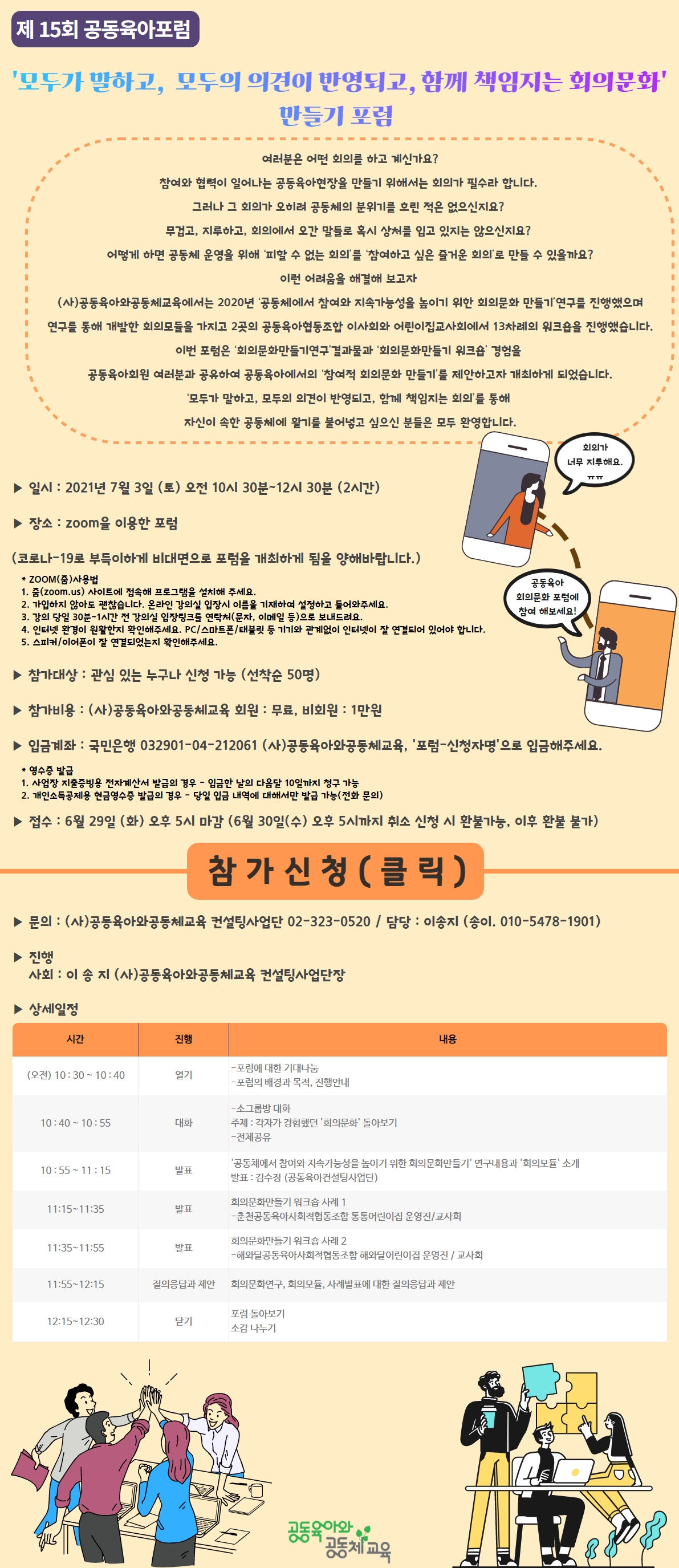 [제15회 공동육아포럼] '모두가 말하고, 모두의 의견이 반영되고, 함께 책임지는 회의문화' 만들기 포럼 안내 페이지 정보 작성자 운영자 작성일21-06-08 18:35 조회2,146회 본문 댓글목록 등록된 댓글이 없습니다. 이전글 다음글 목록