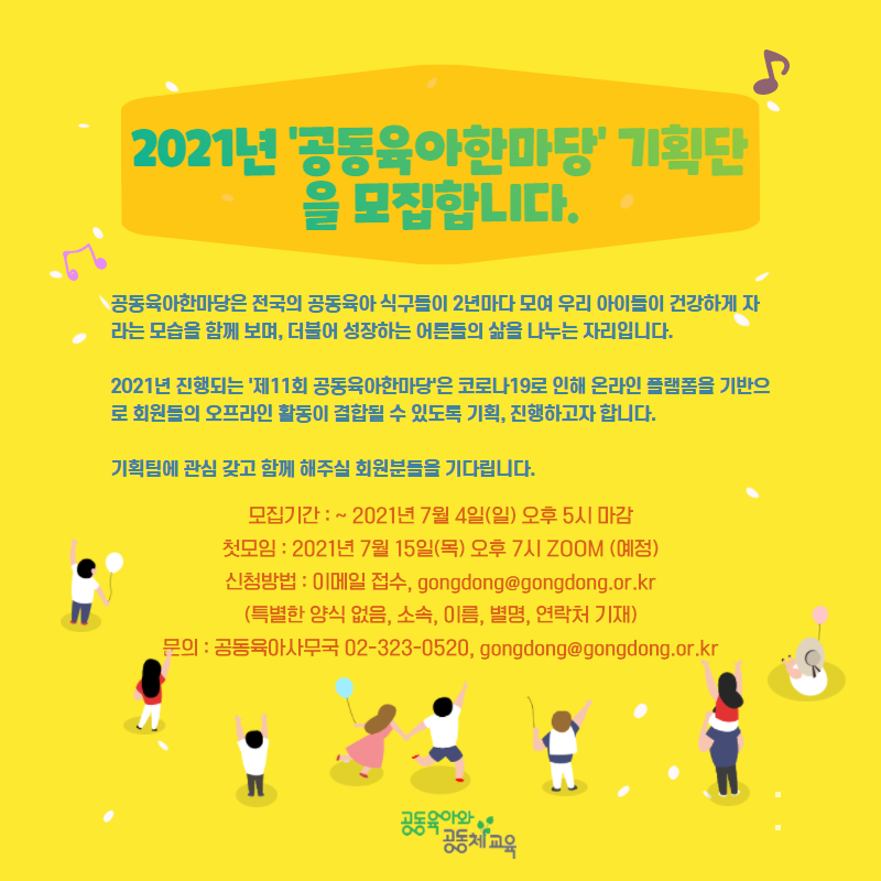 2021년 '공동육아한마당' 기획단을 모집합니다. 페이지 정보 작성자 운영자 작성일21-06-26 16:31 조회1,492회 본문 댓글목록 등록된 댓글이 없습니다. 이전글 다음글 목록